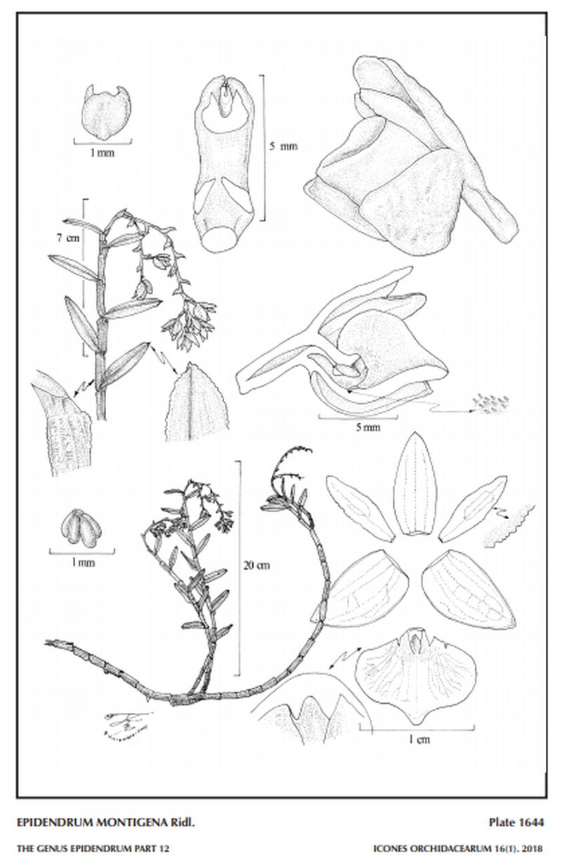 "Epidendrum montigena is part of GROUP Elleanthoides SUBGROUP Rhombochilum recognized by the branching habit, small fleshy leaves and a short 3 to 6 flowered, nutant inflorescence on a short thick peduncle. The species is recognized by the oblong leaves with rounded apex, nutant inflorescence, rachis and peduncle reddish, racemose to paniculate, flowers successive, pink, lateral sepals .28 to .36" [7 to 9 mm] long, petals oblong-elliptic, apical margin (along apical half) dentate, lip widely rhombic in outline, with a pair of narrow, parallel calli which converge into a thin, short mid-rib. Epidendrum imthurnii Ridl. has much narrower leaves, linear-lanceolate, flowers ochre yellow or greenish yellow, sepals .22 to .24" [5.5 to 6.0 mm] long, petals linear, margin entire, lip ovate, apex acute. Epidendrum alsum Ridl. has ovate leaves, inflorescence nutant with the rachis and peduncle green, flowers yellow, sepals .32 to .36" [8 to 9 mm] long, petals narrowly oblanceolate, margin entire, lip clearly 3-lobed." Hagsater etal 2018