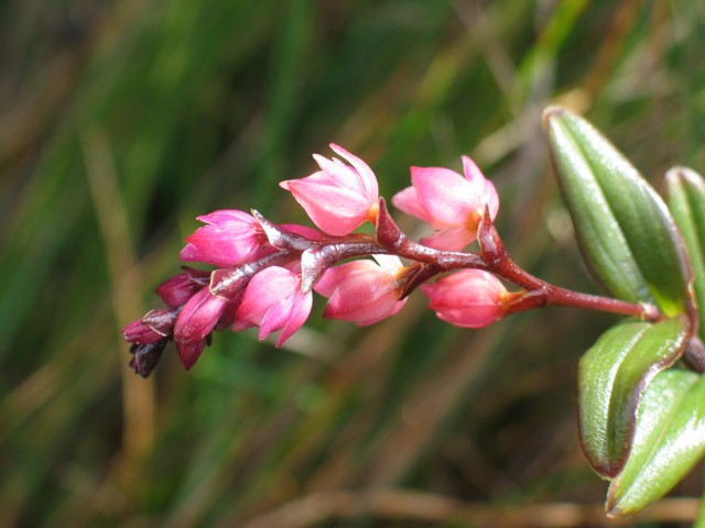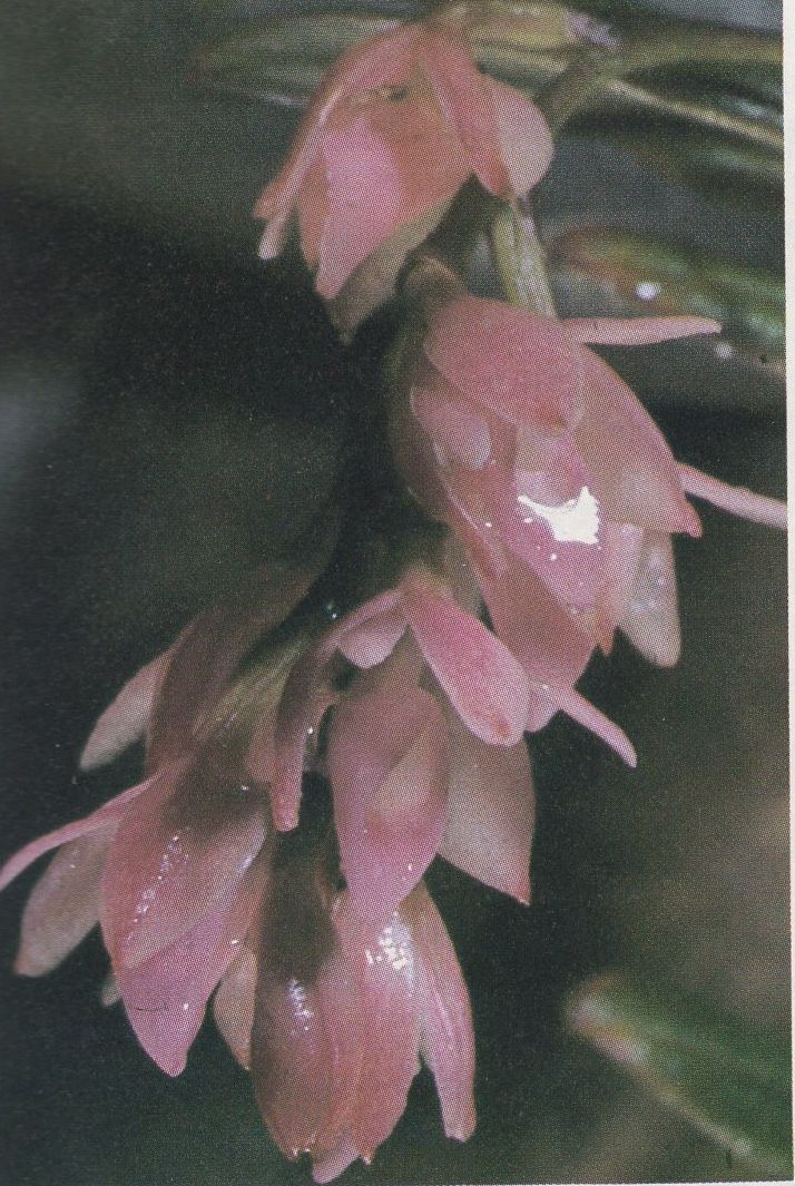 Found in Venezuela in open savannah-like tepui formations at elevations of 2400 to 3000 meters as a medium to large sized, cold growing terrestrial or lithophyte with erect, canelike branching above, terete, straight stems carrying 15 or more on the main stem, 6-to 10 on the shorter branches, distributed throughout the stems, articulate, distichous, sub-coriaceous, spreading, similar in size and shape, green with the margin reddish, upper-side lustrous; sheaths tubular, rugose, striated, reddish, blade oblong, apex rounded, apiculate, apical margin denticulate, somewhat revolute in herbarium specimens leaves that blooms at any time of the year on a terminal, without a spathe, peduncle .38 to .92" [.95 to 2.3 cm] long, thin at base, gradually wider towards the apex, laterally compressed, somewhat ancipitose, reddish, the base with a bract 3 to 7 mm long, tubular, small, amplexicaul, apex sub-acute, 1.2 to 3.4" [3 to 9 cm] long overall, apical, flowering only once, nutant, rachis racemose to paniculate, straight, reddish, successively to several, 10 to 21 flowered inflorescence with prominent, slightly shorter than to as long as the ovary, same color as the rachis, ovate, acute, embracing, rigid, disposed at a right angle with respect to the rachis floral bracts and carrying small, resupinate flowers.