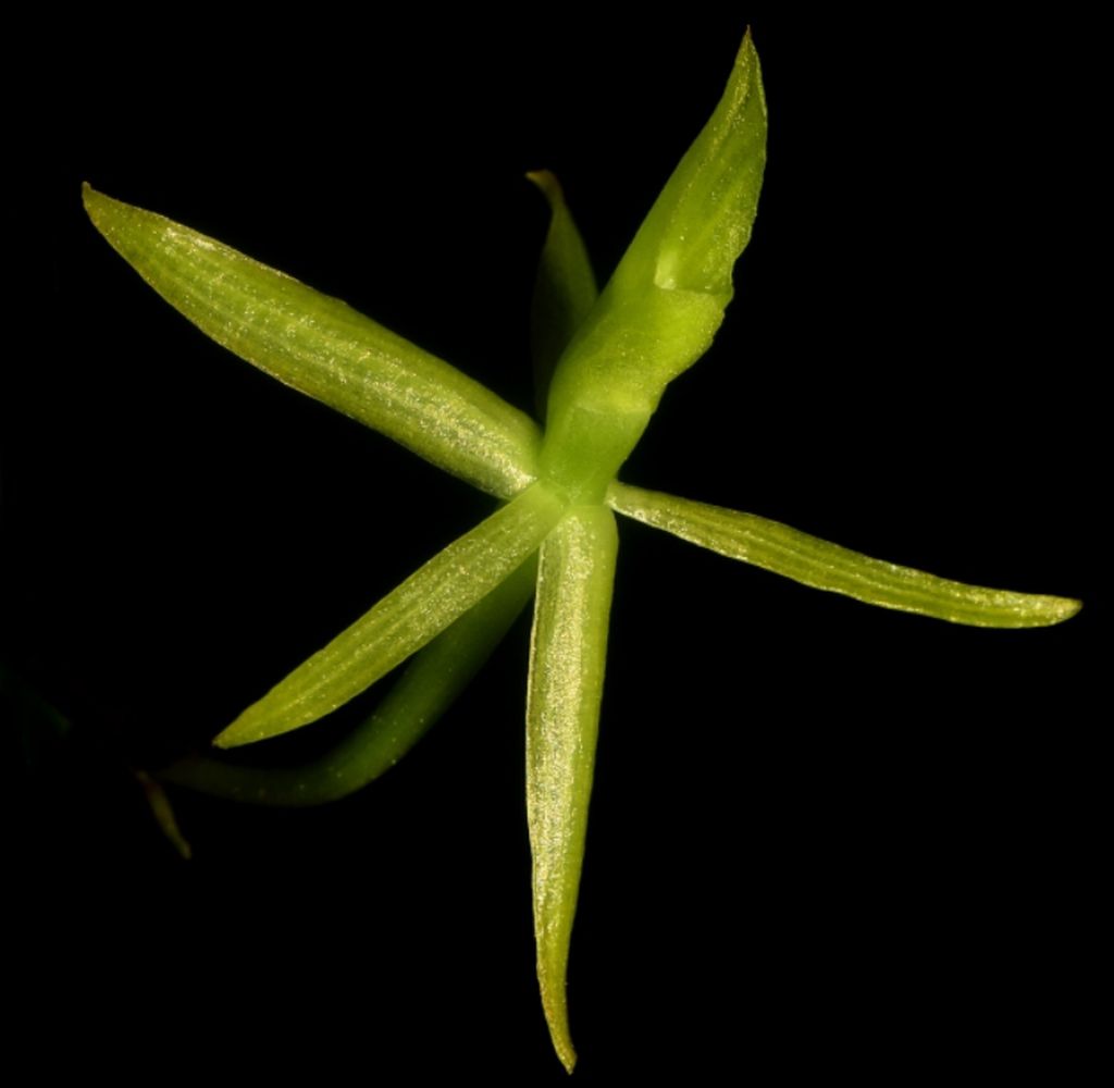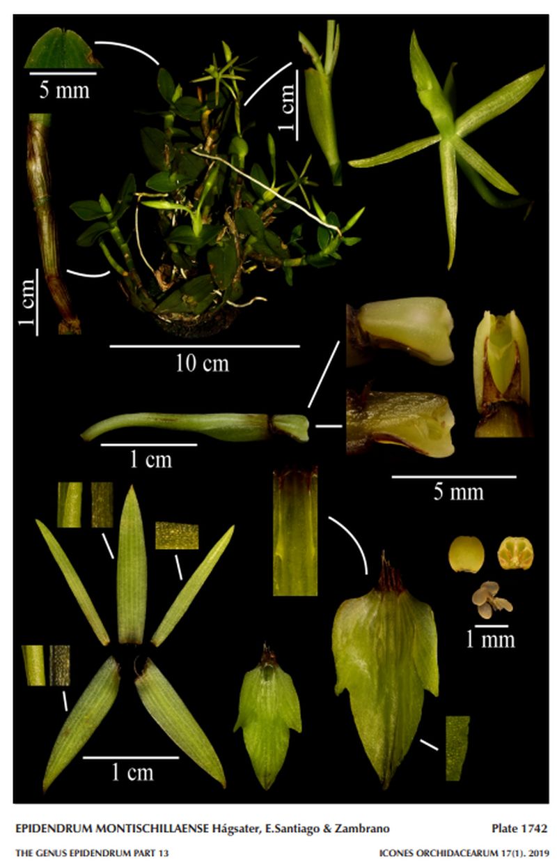 "Epidendrum montischillaense belongs to the GROUP Megagastrium SUBGROUP Cleisogastrium, characterized by the small plants, stems produced from the middle internodes of the previous stem, inflorescences with 1 to 2 spathes, erect with 1 to 2 non-resupinate flowers, lip ecallose, entire or clearly 3-lobed, the lip usually nearly completely free from the column. The new species has leaves .96 to 1.28" x .48 to .68" [2.4 to 3.2 x 1.2 to 1.7 cm] long, oblong-ovate, non-resupinate green flowers, sepals .56 to .64" [14 to 16 mm] long, petals .52 to .56" [3 to 3.5 mm] wide, lip totally united to the column, always wrapped around the column and completely covering it in natural position, base truncate with lateral lobes sub-quadrate, forming an acute angle. Epidendrum niebliense is vegetatively similar, but sepals are 5.2" [12.7 mm] long, a sub-orbicular-rhombic lip free from the column, flat, spreading, ecallose. Epidendrum cleistogastrium Hágsater & Dodson has yellow, cleistogamous flowers, and a lip, 3-lobed and cuneate, with the lateral lobes semi-obovate, which embraces the column and joined only to the base of the column. Epidendrum amplexigastrium Hágsater & Dodson is very similar but the flowers are copper-colored, sepals 7-veined, and the lip excavate in the disc, papillose, base of lip cuneate, lateral lobes obliquely oblong, apex rounded. Epidendrum marsupiale F.Lehm. & Kraenzl. has very thin stems, leaves .44 to 1.2" x .32 to .6" [11 to 30 x 8 to 15 mm], oblong-elliptic, distant from each other, sepals .48" [12 mm] long, a similar lip in both shape and size but the lateral lobes are separated by deep sinuses and spreading in front of the column, the disc of the lip excavate. These last two species having an excavate lip and the column united to the lip belong to the GROUP Megagastrium SUBGROUP Geminflorum." Hagsater etal 2019