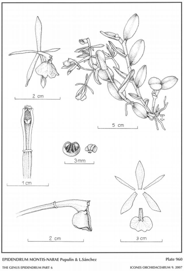 Epidendrum montis-narae is part of GROUP Difforme which is characterized by the caespitose, sympodial plants, fleshy, pale green to glaucous leaves, apical inflorescence, sessile, rarely with a short peduncle, single to many-flowered, and then corymbose, without spathaceous bracts, fleshy, green to yellowish-green rarely white flowers. The species can be recognized by its somewhat laterally compressed stems, ovate-elliptic, suberect leaves, 5 to 7, green to yellowish-green flowers, elliptic-oblanceolate, acute sepals, linear-ligulate, acute petals, 3-robed lip, subreniform to transversally elliptic when spread, semiorbicular-transversly elliptic, entire lateral lobes, midlobe forming two small lobules, with a shallow sinus, apiculate. It is similar to Epidendrum hameri Hágsater & L. Sánchez, from the Pacific slopes of the Volcán Mombacho in Nicaragua, but that species has imbricating upper leaves, 1 to 2 small, very pale yellow-green translucid flowers, obovate, rounded sepals, linear-oblanceolate, rounded petals, and dolabriform, crenate lateral lobes of the lip, with the midlobe separated from the lateral lobes by wide sinuses. Epidendrum citrosmum Hágsater, another similar species from the Pacific slopes, endemic to the semideciduous and deciduous forests of the Sierra Madre in southern Mexico, has terete stems, bright green flowers, rounded sepals and petals and a reduced, entire clinandrium hood. Epidendrum vulgoamparoanum Hágsater & L. Sánchez from the Pacific watershed of Costa Rica and Panama, found in seasonally dry and secondary forests along the Pacific coast has taller plants and larger flowers with elliptic to ovate leaves, a widely obovate, obscurely 3-lobed lip with many thickened veins; the midlobe is obscurely biloed, and the prominent clinandrium-hood is erose-fimbriate." Hagsater etal 2007