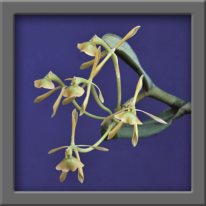 Found in Costa Rica in premontane rain forest to cloud forest and disturbed primary forests at elevations around 85 to 1100 meters as a medium to large sized, hot to just cool growing epiphyte with simple, cane-like, slightly laterally compressed, slightly flexuous stem carrying 4 to 8, throughout the stem, erect, elliptic to ovate-elliptic, unequally bilobed, subcoriaceous leaves that blooms in the spring on a terminal, flowering only once, sessile, subcorymbose inflorescence with 5 to 7, simultaneous, resupinate, nocturnally fruity fragrant flowers.
