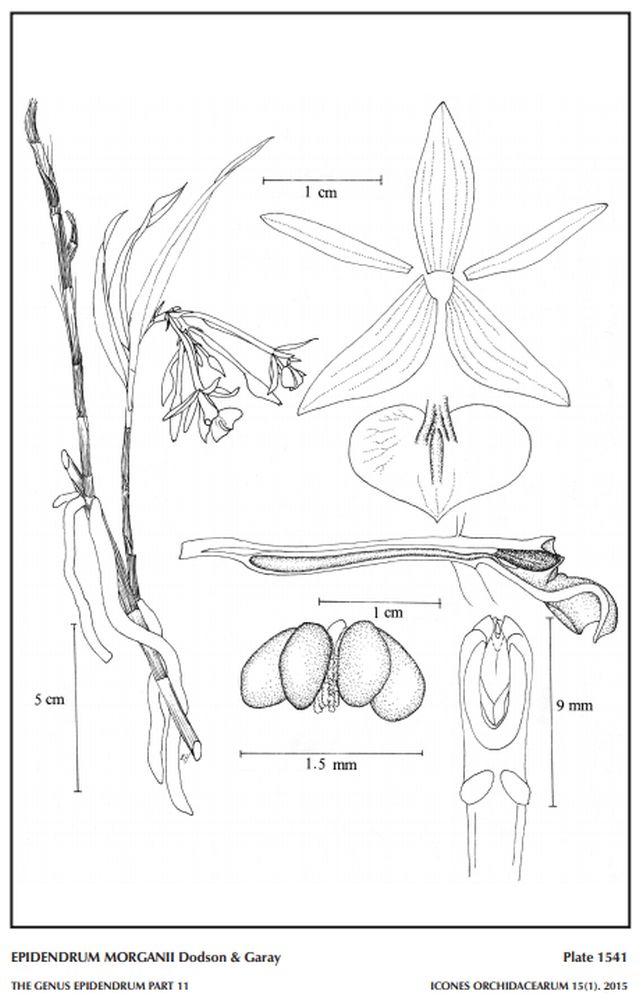 "Epidendrum morganii belongs to the GROUP Arbuscula which is characterized by the erect habit with successive lateral growths produced from the middle of the previous growth, few leaves aggregate towards the apex of the stems, roots produced generally only from the base of the primordial stem, and the SUBGROUP Incomptum which has a short apical inflorescence with fleshy yellowish to green to violet-green to black flowers with short ovaries, the lip entire to 3-lobed. This species is recognized by the short, few-flowered inflorescences, successive, green flowers tinged with purple-brown, sepals .52 to .72" [13 to 18 mm] long, the lip widely cordiform, apiculate, with two low, laminar, divergent calli. Epidendrum ecostatum Pabst, described from Brazil, has similar but smaller flowers, and the lip lacks any calli. Epidendrum jamaicense Lindl. also has an inflated nectary, but the lip is reniform, with the apex rounded and somewhat emarginate, revolute in natural position, and the lateral sepals are aristate. Epidendrum prietoi Hágsater has been described from the same general area of Ecuador, but that species as a clearly 3-lobed lip." Hagsater etal 2013