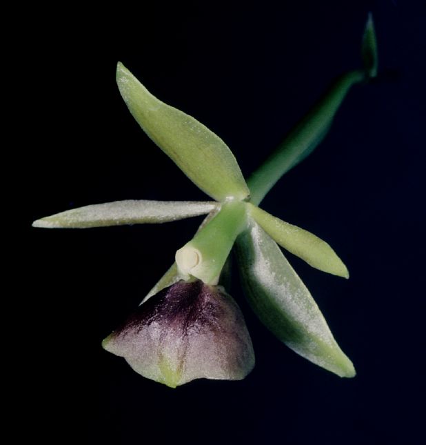 Found in Ecuador in seasonally dry forests at elevations of 1100 to 1800 meters as a medium sized, cool growing epiphyte with canelike, successively branched once towards the apex stems enveloped completely by distichous, flattened, tubular, leaf bearing sheaths and carrying narrowly elliptic, acuminate, membraneous leaves that blooms in the spring through early summer on a terminal, without a spathe, racemose, to 2.4" [6 cm] long, successively 1 to 3, 5 to 24 flowered inflorescence with much shorter than the ovary, narrowly triangular, long-acuminate, amplexicaul floral bracts and carrying green, resupinate, morning sweet fragrant flowers with the lip tinged with purple brown.