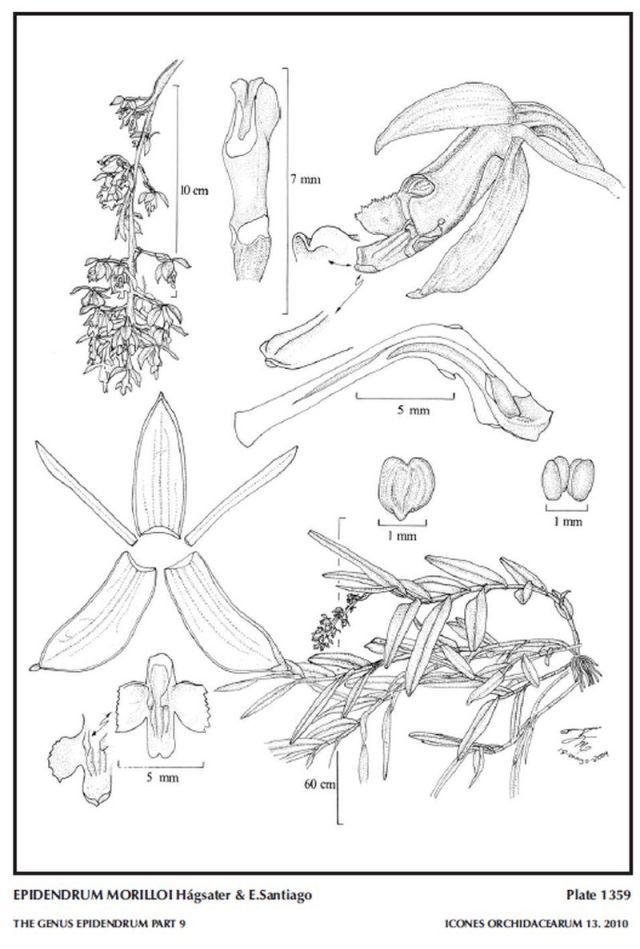 "Epidendrum morilloi belongs to the GROUP Alpicolum SUBGROUP Alpicolum which is characterized by the simple, cane-like stems, long, narrow 1 to 3 spathaceous bracts, fox-tail-like inflorescence and numerous flowers with fleshy lip. This species is distinguished by the arching-nutant stems, the paniculate inflorescence (though the branches are short and few), the creamy white sepals and petals, with a snow-white lip and column, the flowers comparatively smaller, sepals .34 to .4" [8.5 to 10 mm] long. Epidendrum kltozscheanum has erect and straight stems, a racemose inflorescence, the inflorescence more compact, with many more flowers, the margin of the lateral lobes of the lip minutely erose, and fuchsia to yellowish tinged with pink flowers, sepals .56" [14 mm] long. Epidendrum sisgaënse Hágsater, from north of Bogotá is somewhat similar, but the flowers are larger, sepals .76 to .8" [19 to 20 mm] long, green to brownish-green tinged reddish, the inflorescence arching, few-flowered, and the 3-lobed lip has a slightly erose margin, with the mid-lobe rectangular, somewhat wider than long. Epidendrum charpinii Hágsater & E.Santiago has a racemose inflorescence, ochre-colored flowers, the lip somewhat paler, with the mid-lobe of the lip somewhat apically rhombic, widened near the acute apex, sepals erect and spreading." Hagsater etal 2010