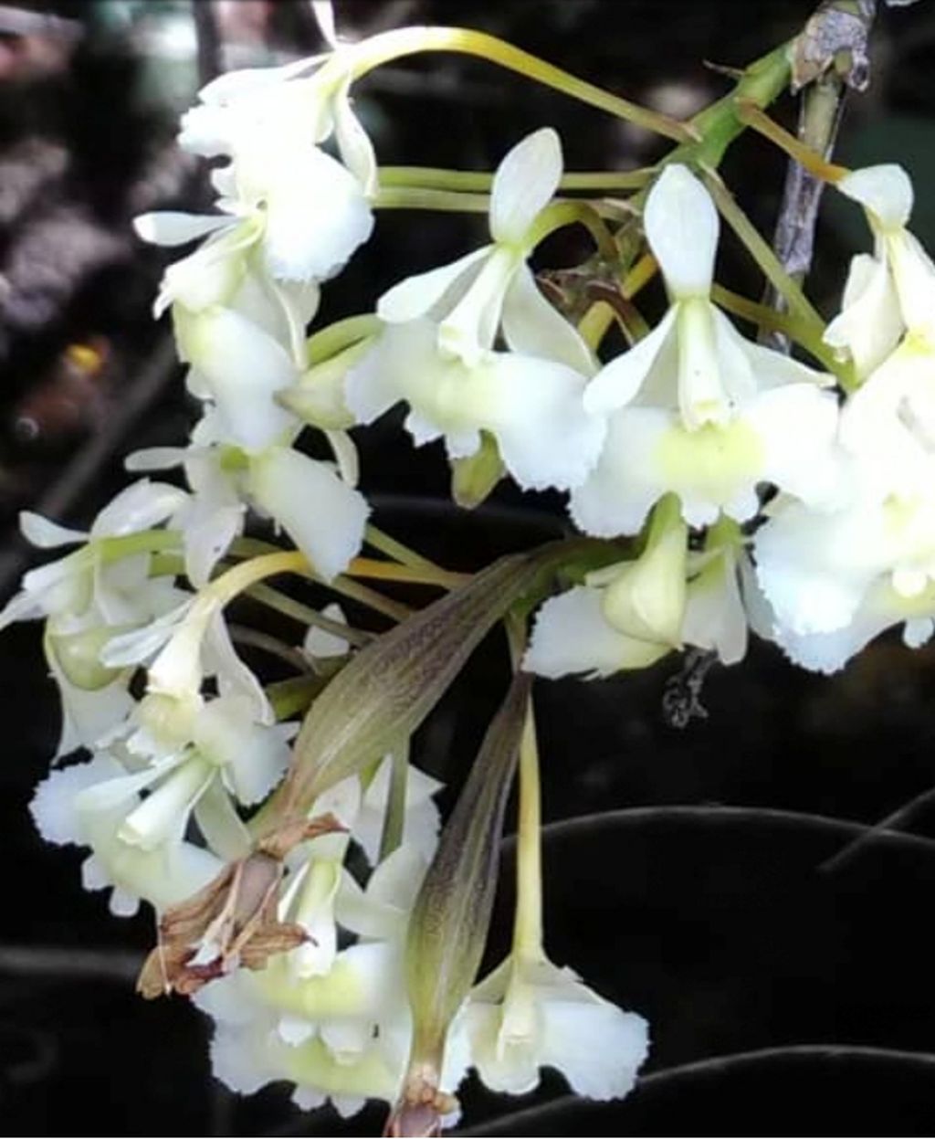 Found in Ecuador apparently endemic and common on the western slopes of the Cordillera Occidental of the Andes in the basin of Loja and neighboring Peru, in dry scrub forest sometimes with cacti at elevations of 320 to 2000 meters as a large to giant sized, hot to cool growing epiphyte with thickened, fusiform, erect, straight, fluted, yellow-green; covered when young by non-foliar, tubular, scarious sheaths and carrying 1 to 2, apical, conduplicate at the base, erect, thick, coriaceous; blade oblong, acute, minutely apiculate, green, margin entire, spreading leaves that blooms in the spring, summer and fall without a spathe, peduncle to 2 x .12" [50 x 0.3 cm] long, terete, provided with tubular, triangular, embracing, acute to slightly acuminate bracts; rachis to 2.4" x .08 to .12" [60 x 0.2 to 0.3 cm], to 48" [120 cm] long, paniculate, producing short, racemes from the apical nodes of mature stems, erect to arching; each raceme 1 to 1.4" [2.5 to 3.5 cm] long, successively to 5, 11 flowered inflorescence with much shorter than the ovary, progressively shorter towards the apex of the raceme, triangular, acuminate, embracing floral bracts and resupinate, cream colored in general flowers with the center of the lip greenish yellow turning pale yellow, column green at the base and cream to the apex; without any apparent fragrance