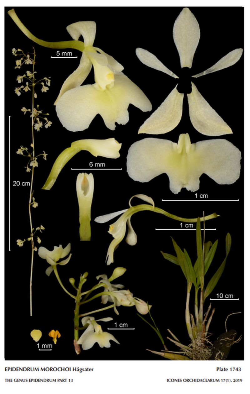 "Epidendrum morochoi belongs to the GROUP Blepharistes recognized by the caepitose habit, simple fusiform stems, oblong leaves, lacking spathes, erect to nutant inflorescences, producing several short racemes from several nodes of the rachis along the upper half of the inflorescence, lip widely 3- lobed, reniform lip, the mid-lobe sub-quadrate and itself bilobed. The new species is recognized by the erect pseudobulbs, leaves 1 to 2, lanceolate, coriaceous, flowers cream colored in general, center of lip greenish yellow turning pale yellow, column green at the base and cream to the apex, sepals .32 to .36" x .12" [8 to 9 x 3 mm], acute, petals 3.32 x .8" [8.3 x 2 mm], lanceolate-ovate, apex obtuse to rounded, and lip .24 x .6" [6 x 15 mm], slightly cordiform trilobate, mid-lobe with 2 little lobes with margin crenulate, wider than long. It is very similar to Epidendrum polystachyum which has apricot-yellow flowers but has 3 leaves spread out along the apex of the stem; this species is found on the eastern side of the Cordillera Occidental of the Andes, in southern Ecuador in the basin of Malacatos and the Cordillera del Cóndor, and northern Peru. Epidendrum pseudopolystachyum D.E.Benn. & Christenson from central Peru, on the Eastern side of the Andes has short plants, to 8.8" [22 cm] tall, bifoliate with oblong-elliptic leaves and greenish flowers, the petals and the lip transverse, convex, with entire margins, .264 x .52" [6.6 x 13.0 mm], with lateral lobes elliptic, obtuse-redounded, mid-lobe bi-lobulate, lobules sub-orbicular, obtuse-rounded. Epidendrum blepharistes Barker ex Lindl. is widespread from Costa Rica to Bolivia; has 4 to 10 leaves distributed along the upper half of the stem, flowers white to lilac-pink to purple, lip 3-lobed, somewhat convex, the base slightly cordate, apical margin of the lobes deeply dentate; lateral lobes spreading, oblong-dolabriform, oblique; mid-lobe cuneate, retuse, bilobed, nearly as long as the lateral lobes." Hagsater etal 2019