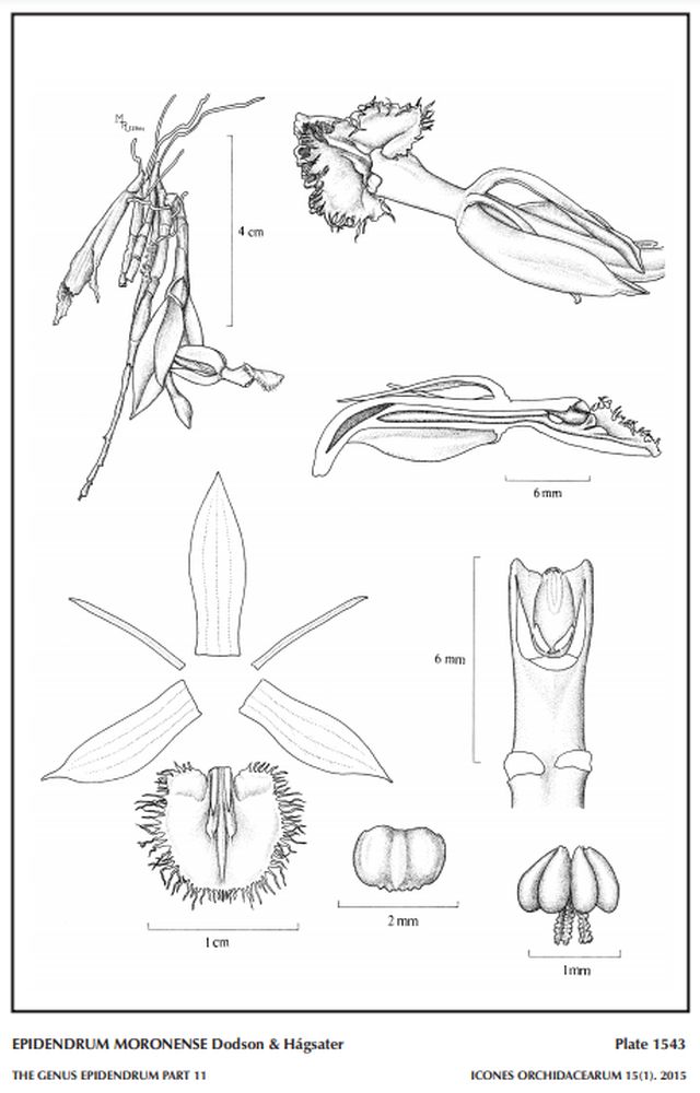 "Epidendrum moronense belongs to the GROUP Filamentosum which is characterized by the caespitose habit with thickened stems, with 1 to 4 fleshy, coriaceous leaves, the inflorescence apical, distichous, with successive, nonresupinate flowers, the lip un-lobed, margin fimbriate, bicallose. The species is recognized by the thickened stems 1.6" [4 cm] long, 1 to 4, lanceolate elliptic leaves, non-resupinate flowers, greenish, to pinkish or buff, the lip white, sometimes tinged with pale pink, column green, anther white, strongly reflexed sepals and petals nearly as long as the ovary, and the lip is reniform to sub-orbicular, with the margin deeply laciniate. Epidendrum ruizlarreanum D.E.Benn. & Christenson a single, linear leaf, has white, concolor flowers, spreading sepals, petals parallel to the column, the oblong-ovate, un-lobed lip with the margin fimbriate, high, laminar calli, and 3 narrow ribs, the reniform anther is truncate." Hagsater etal 2013