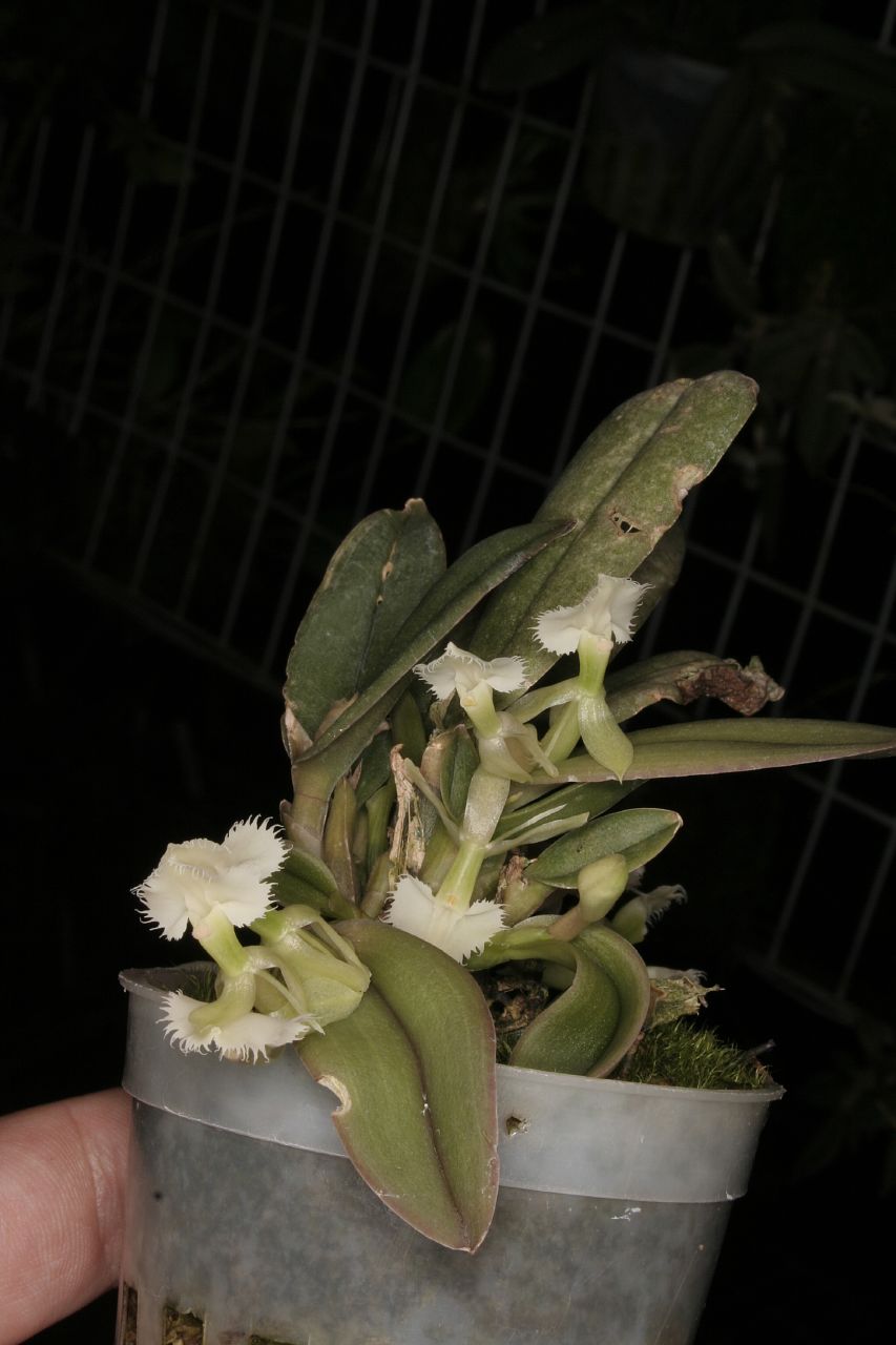 Found in Ecuador in very wet montane forests at elevations of 700 to 1400 meters as a mini-miniature sized, warm to cool, pendant growing epiphyte with laterally flattened, newly arising from the base of the previous stem, barely distinguishable pseudobulb-like, green tinged with purple stems enveloped by pinkish foliaceous sheaths and carrying 1 to 4, apical, aggregate towards the apex, distichous, lanceolate-elliptic, falcate, acute, articulate, dorsally green, margin purple, ventrally purple red, margin entire leaves that blooms from fall through spring on a terminal, arising through a basal, prominent, flattened, acute, narrowly elliptic spathe, pendulous, recurved, peduncle subterete, very short, rachis sinuous, racemose, 1.2" [3 cm] long, secund always facing away from the substrate, successively 1 to 2, 3 to 7 flowered inflorescence with much shorter than the ovary, triangular, acute, amplexicaul floral bracts and carrying non-resupinate, fleshy, lustrous, greenish to pinkish or buff flowers with a white lip that is sometimes tinged with pale pink, a green column and a white anther.