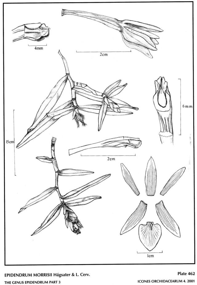 "Epidendrum morrisii belongs to the GROUP Ramosum SUBGROUP Paranense, characterized by the pendent, branching plants with long coriaceous leaves and distichous inflorescence, oblong to oblong-lanceolate leaves. The species can be recognized by its laterally compressed stems, large leaves 2 to 76" [5 to 19 cm] long, lax-flowered inflorescence, sepals .4 to .64" [10 to 16 mm] long, petals .56 to .6" [14 to 15 mm] long, cordiform lip, long column, .24" [6 mm] long, and reduced clinandrium. Epidendrum mora-retanae Hágsater, from Nicaragua to Panama, has terete stems, smaller flowers, the sepals .4 to .48" [10 to 12 mm] long, petals .4 to .44" [10 to 11 mm] long and the clinandrium as long as the column proper. Epidendrum bahorucense Hágsater & L. Cerv., from the island of Hispaniola, has terete stems, smaller and narrower leaves, smaller flowers, triangular lip, smaller column, .16" [4 mm] long.