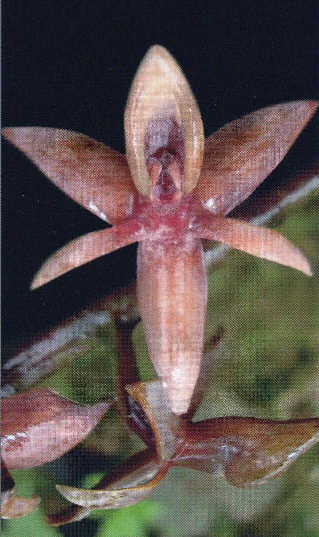 Found in Cauca and Valle de Cauca departments of Colombia, in montane broadleaf forests at elevations of 1700 to 2600 meters as a large sized, cool to cold growing terrestrial or lithophyte with branching when mature, cane-like, terete, erect, straight stems carrying numerous on the main stem, alternate, all along the stem, narrowly elliptic, acute to subacute, margin entire, slightly revolute leaves that blooms in the later spring though late fall on a terminal, without a spathe, racemose, erect, occuring only once, peduncle 1.6 to 1.72” [4 to 4.3 cm] long, terete, erect, straight, with a widely triangular, acute median bract, rachis 13.2 to 13.6” [33 to 34 cm] long, terete, gradually thinner towards the apex, simultaneously 19 to 21 flowered inflorescence with prominent, slightly longer than the ovary, progressively shorter above, triangular, acute, amplexicaul floral bracts and carrying non-resupinate, fleshy, scarlet flowers that turn greyish brown after the pollina is extracted.
