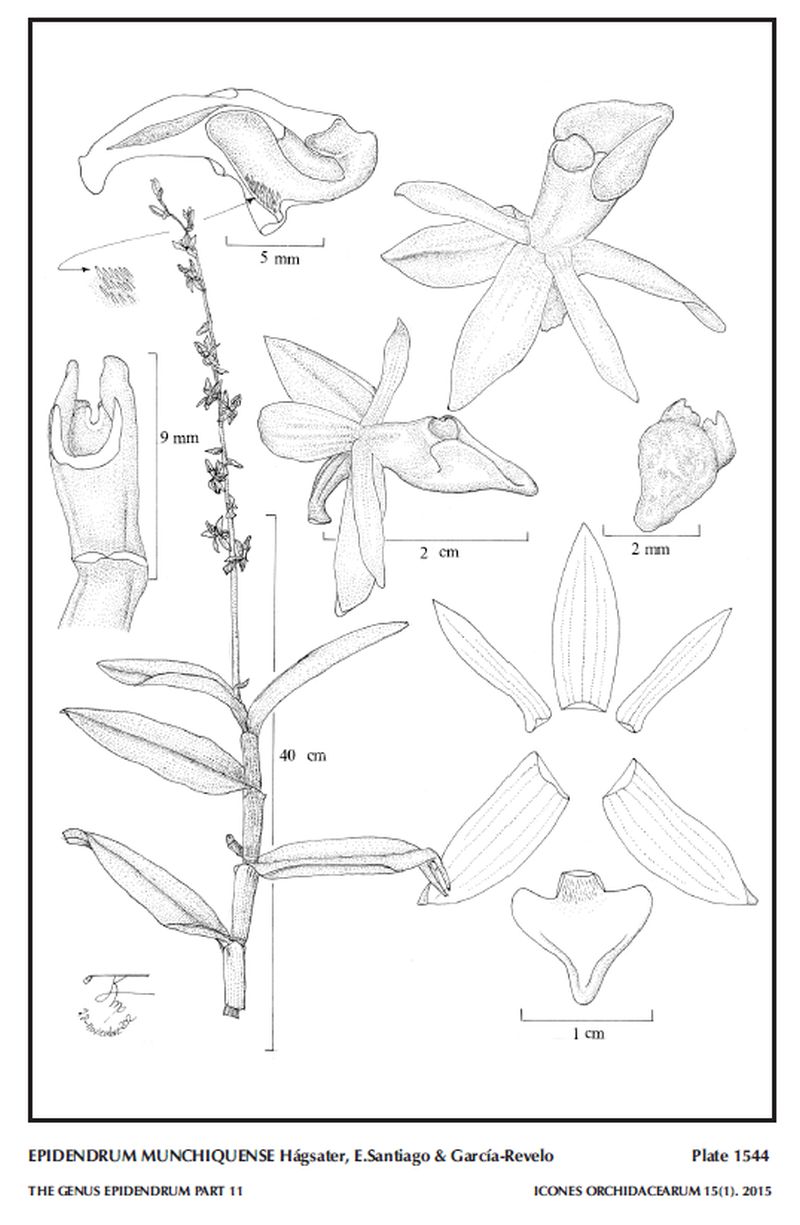 "Epidendrum munchiquense belongs to the GROUP Macrostachym SUBGROUP Macrostachyum , which is characterized by the monopodial plants with sub-apical branching, rugose leaf sheaths, large leaves generally spreading, racemose, erect inflorescence, and fleshy flowers generally green to black (ripe olive colored), as well as yellow to pink to purple, with an entire, conduplicate, generally ecallose and pubescent lip embracing the column, and the nectary pubescent to papillose in front of the stigmatic cavity and at least at the base of the lip. The species is recognized by the elongate inflorescence to 16" [40 cm] long, erect and few-flowered, the flowers simultaneous, laxly distributed throughout the rachis, sepals and petals .64 to .72" [14 to 18 mm] long, apex acute, nectary wide throughout. Epidendrum chondrochilum Schltr. has a pyramidal, many flowered inflorescence, densely distributed, successive flowers, sepals .44 to .46' [11 to 11.5 mm] long, the apices obtuse, and the nectary narrow throughout. Epidendrum oxycalyx Hágsater & Dodson has densely aggregate flowers throughout the rachis, sepals .6 to .92" [15 to 23 mm] long, apex acuminate, nectary narrow and the lip triangular with the base deeply cordate." Hagsater etal 2015
