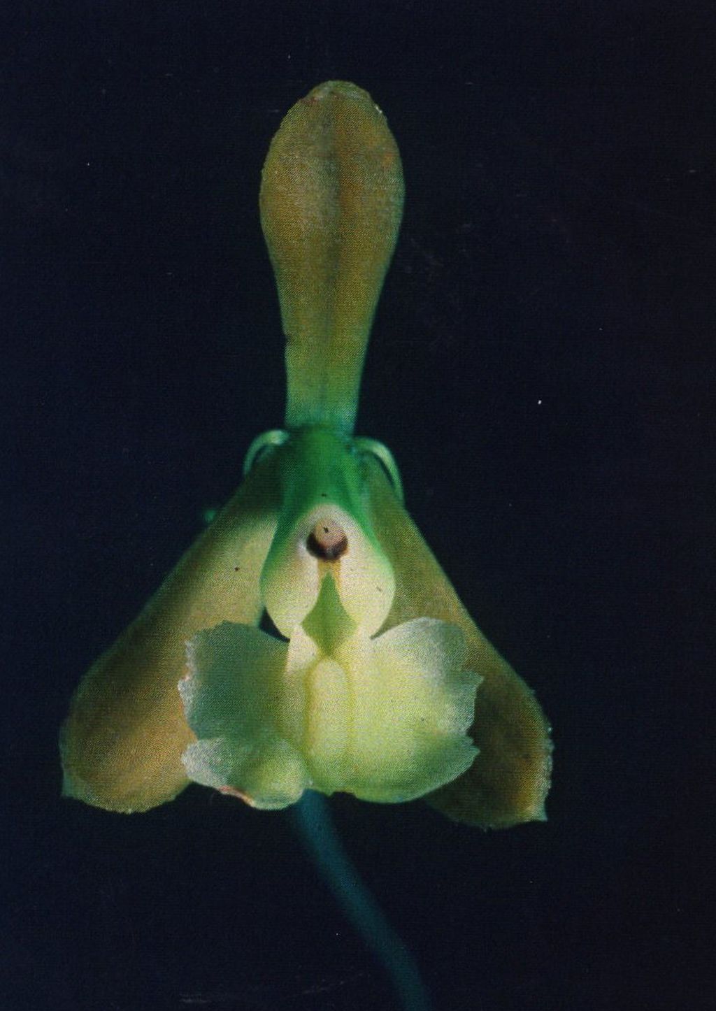 Found in southwestern Colombia and northwestern Ecuador on rocks and exposed ground in very wet, tall forests at elevations around 600 meters as a medium to giant sized, warm growing terrestrial or lithophyte with simple, cane-like, terete, erect, straight stems carrying numerous all along the stem, elliptic, acute, clearly marked veins, membraneous leaves that blooms in the spring and summer on a terminal, paniculate but racemose if stressed or youthful, erect, arcuate, peduncle short, terete, erect, with none to 2, lanceolate, acuminate bracts, 7.2 to 9.8" [18 to 24 cm] long, simultaneously 12 to 140 flowered inflorescence with much longer to shorter than the ovary, lanceolate, acuminate, progressively shorter above floral bracts and carrying resupinate, thin, slightly fragrant, light ochre colored flowers with the lip and column white and the base green.