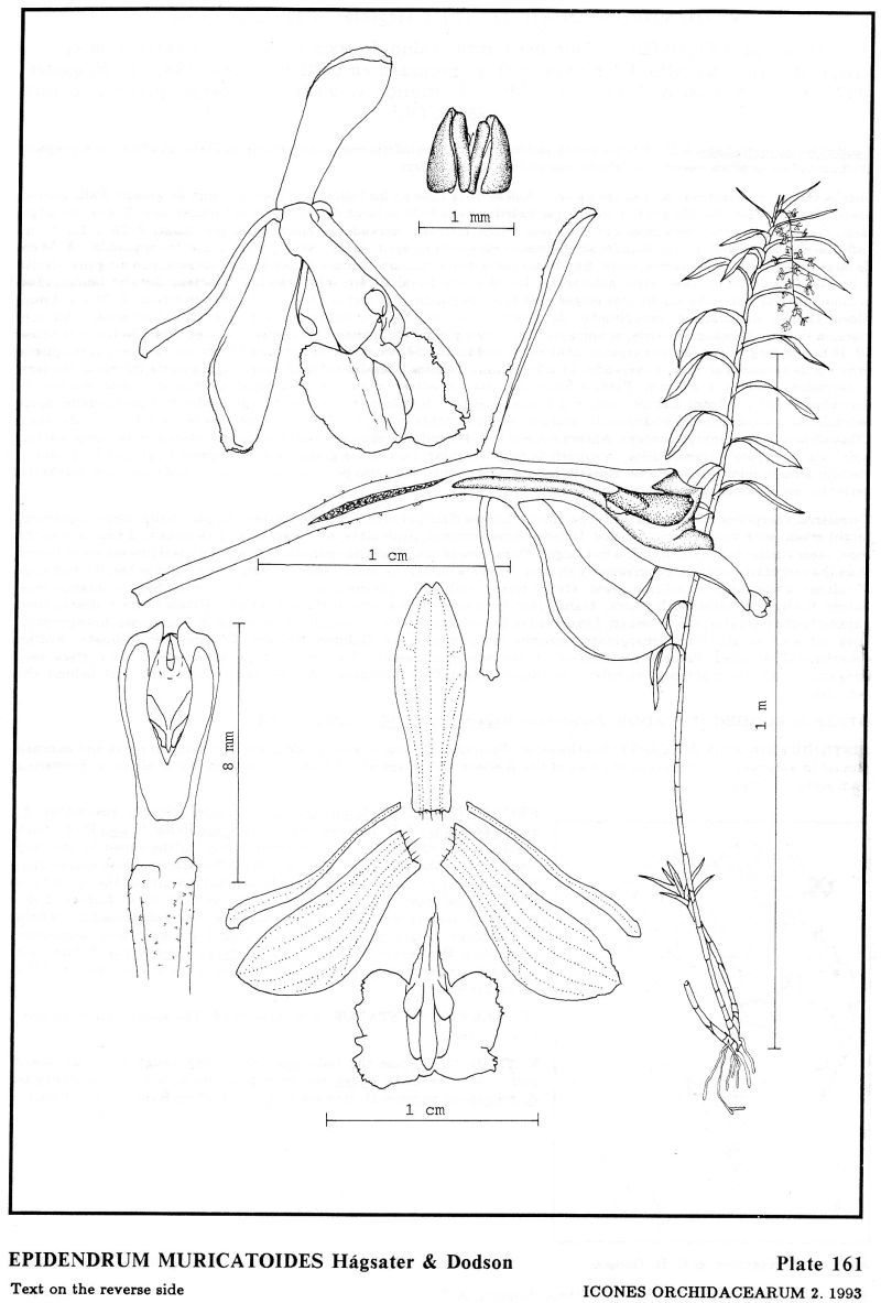 "Epidendrum muricatioides is part of GROUP Goodspeedianum characterized by the sympodial, caespitose, cane like stems, paniculate inflorescence, leaves with prominently marked veins, flowers with an entire lip and the margin erose to fimbriate and has filiform petals. The species closely resembles E. goodspeedianum A.D. Hawkes (=E. muricatum Rchb. f., non Poir.) both vegetatively and florally; it is, however, easily distinguished by the very long bracts of the lowermost flowers of the inflorescence, much longer than the respective ovaries, the erose not fimbriate margins of the lip and the sparse, translucent trichomes on the ovary and the outer surface oí the sepals (not densely muricate). Both species are easily recognized in the field by the large, bright green leaves with clearly marked veins, somewhat resembling the leaves of maize. Epidendrum calothyrsus Schltr. has muricate ovaries, very large bracts at the base of the inflorescence and the lip deeply erose.'Hagsater etal 1993