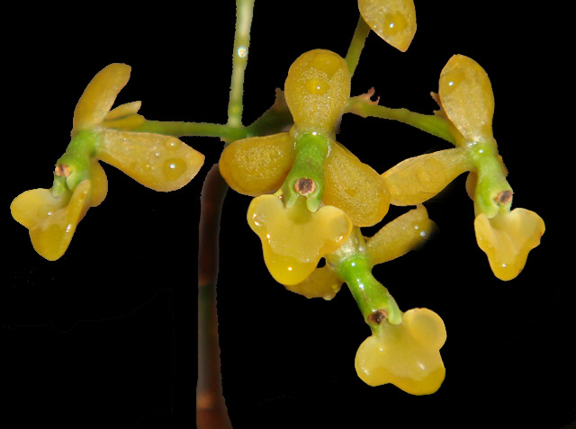 Found in Panama, Colombia, Venezuela, Guyana, Surinam, Fr Guiana, Brazil, Ecuador Peru and Bolivia at elevations of 70 to 1200 meters as a small to large sized, hot to cool growing epiphyte with simple, cane-like, ancipitous, straight stems carrying 4 to 10, distichous, all along the upper 2/3's of the stem, rarely tinged purple, elliptic, obtuse to retuse apically, mucronate, coriaceous, becoming conduplicate towards the base leaves that blooms at most any time of the year on a terminal, racemose to pluriracemose, subcorymbose, dense, elongate, ancipitous, 5" [12.5 cm] long, 7 to 25 flowered inflorescence with 3 to 12, imbricate, tubular, laterally compressed, oblong acute to obtuse bracts and much shorter than the ovary, amplexicaul, triangular-ovate, acuminate floral bracts and carrying simultaneously opening, non-resupinate flowers that can produce new racemes from the same inflorescence over several years and thus appearing paniculate inflorescence.