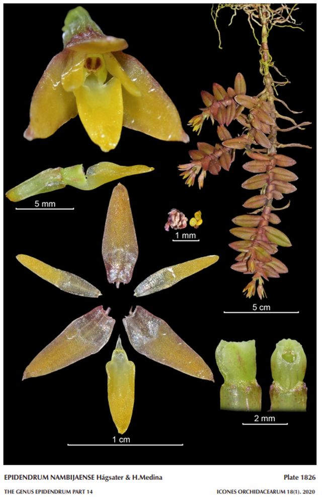 "Epidendrum nambijaense belongs to the GROUP Nanum , which is characterized by the Dichaea-like pendent stems, the inflorescence produced by pairs of opposite flowers, without spathaceous bracts, but with prominent floral bracts. The new species is recognized by the plants 2.32" to 8" [5.8 to 20 cm] long, widely lanceolate leaves, reddish brown, the ovate-triangular floral bracts, the resupinate yellow to pale brown flowers, column green, with sepals ovate-lanceolate, .32 to .36 x .24 to .128" [8.0 to 9.0 x 2.9 to 3.2 mm], and petals linear-lanceolate, obtuse, and by the small sub-entire lip, .24 x .08" [6.0 x 2.0 mm], the mid-lobe triangular in general form, basal corners rounded, fleshy, with no lateral lobes, margin entire, apex obtuse; ecallose. Epidendrum integrinanum Hágsater has large, plants (about ca. 2.4 to 12" [6 to 30 cm] long, green concolor leaves, flowers white with green tone, with dorsal sepal oblanceolate, and lateral sepals oblanceolate-elliptic, .372 to .384 x .1 to .124" [9.3 to 9.6 x 2.5 to 2.6 mm], petals linear, and by the small sub-entire lip, .16 x .1" [4.0 x 2.5 mm], the mid-lobe triangular (longer than wide) and the lateral lobes very reduced, hemi-orbicular and rounded. Epidendrum vesicinanum Hágsater & L.Valenz. has smaller plants, 1.76 to0 2.68" [4.4 to 6.7 cm] long, light green flowers, a lanceolate dorsal sepal, .224 to .24" [5.6 to 6.0 x 1.8 to 2.0 mm], petals linear, acute, and by 3-lobed, bicallose lip, .124 x .1" [3.1 x 2.5 mm], with lateral lobes reduced, transversely elliptic, and the mid-lobe lanceolate." Hagsater etal 2020