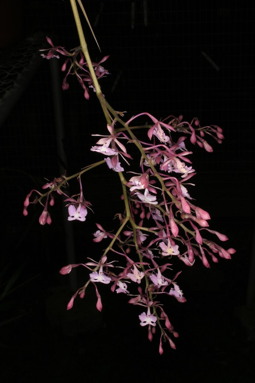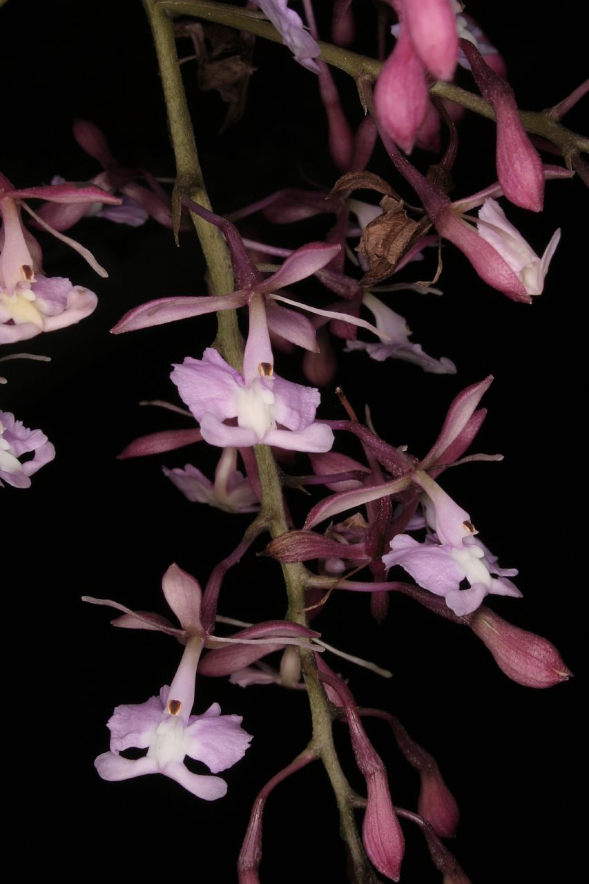 Found in northern Ecuador on the western slopes of the Andes in subtropical rainforests at elevations around 1600 to 2200 meters as a giant sized, cool to cold growing epiphyte with simple, cane-like, terete stems carrying many, all along the stem, elliptic to narrowly elliptic, acuminate, margin entire, basally clasping leaves with tubular, smooth basal sheaths that blooms in the spring on an apical, paniculate, erect, 4" [10 cm] long inflorescence with simultaneously opening, resupinate flowers.