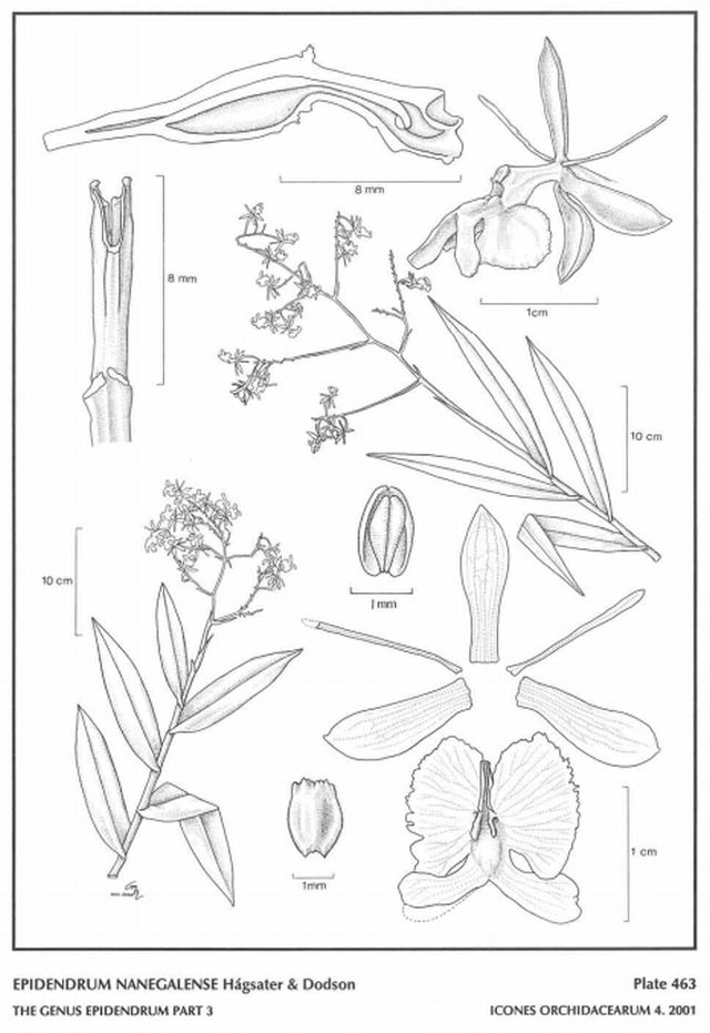 " Epidendrum nanegalense belongs to the GROUP Pseudepidendrum SUBGROUP Paniculatum which is recognized by the cane-like stems, paniculate inflorescence, filiform petals, thin column and unequal, bird-wing type pollinia. This species is recognized by the inflated nectary forming a prominent vesicle a rare occurrence in this group, large flowers, probably purple, the large, deeply cordate lip, the lateral lobes dolabriform and erose, the apical lobes divergent, dilated towards the apex. It has been misidentified as Epidendrum porphyreum due to the superficial appearance and color of the flowers, but that species does not have an inflated ovary, and has smaller flowers, the lip fleshy with the callus proportionately much larger, and the apical lobes triangular, narrowed towards the apex. Epidendrum peraltum Schltr. has larger f1owers, the sepals .6 to .72" [15-19 mm] long, the apical lobes small and opposite, with a large callus, and uninflated ovary. Epidendrum nanegalense is sympatric with Epidendrum embreei Dodson, and they have been collected together, though the latter has smaller, orange flowers with the segments partly spreading and a thin, uniflated ovary." Hagsater etal 2001