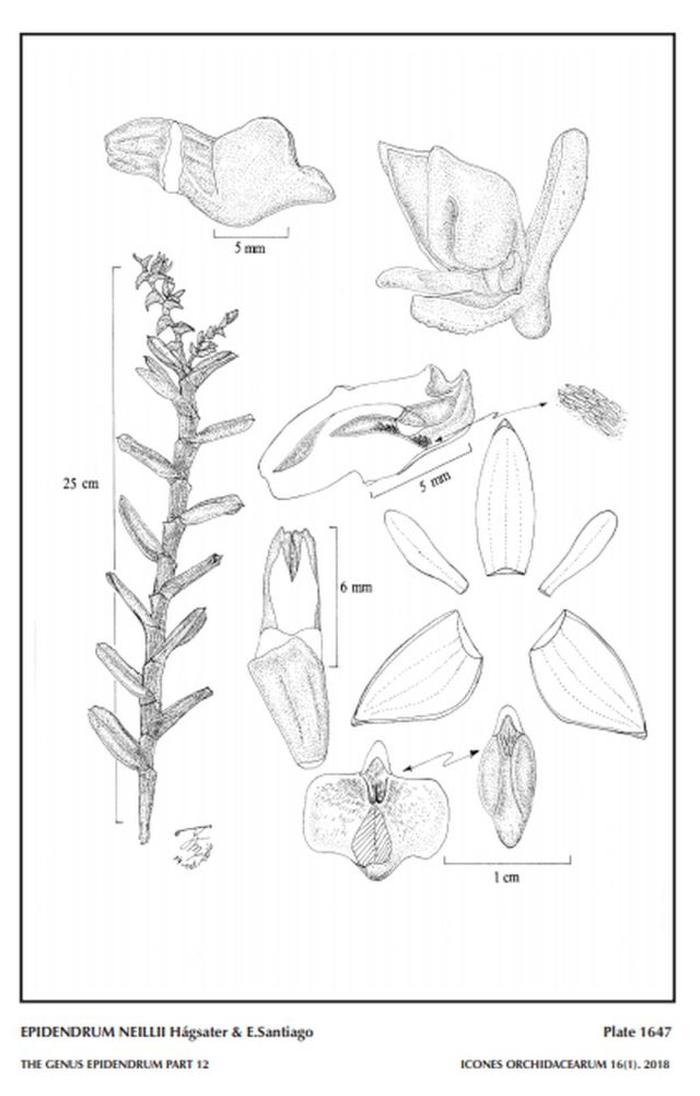 "Epidendrum neillii belongs to the GROUP Aquaticum which is characterized by the monopodial, branching habit, the distichous, and erect to arching-nutant inflorescence, with fleshy flowers, and the disc of the lip and/or nectary often pilose. The species is recognized by the leaves 2.5-3.6 x 1.0-1.8 cm, oblong-elliptic with the margin revolute, inflorescence sub-erect and few-flowered with prominent floral bracts (5-10 x 6-10 mm), sepals 11 mm long, petals .33" x .094" [8.3 x 2.4 mm], oblanceolate with the apex rounded, and the lip entire with base truncate. Epidendrum alsum has similar-sized leaves but ovate, inflorescence nutant, sub-densely many-flowered, floral bracts small .2 to .26" x .16 to .2" [5 to 6 x 4 to 5 mm], embracing, sepals .32 to .36" [8 to 9 mm] long, petals .28 to .36 x .76 to .84" [7 to 9 x 1.9 to 2.1 mm], narrowly oblanceolate, apex acuminate, and the lip 3-lobed, base cuneate. Epidendrum urbanianum Cogn. has oblong-lanceolate leaves 1 to 3.8" x .4 to .8" [2.5 to 9.5 x 1.0 to 2.0 cm], inflorescence arching with the bracts nearly as long as the flower .2 to .48" x .28 to .4" [5 to 12 x 7 to 10 mm]; sepals .28 to .4" [7 to 10 mm] long, and petals linear, .22 to .28" x .4 to .6" [5.5 to 7.0 x 1.0 to 1.5 mm]. Other species related to this group from the Andean tepuys are Epidendrum stenocalymmum Hágsater & G.Calatayud, which has very similar floral bracts and flowers in size and shape, but the inflorescence is racemose, leaves 1.2-2.1 x 0.9-1.2 cm, ovate; petals 7.7-8.0 x 2.0-2.2 mm, oblanceolate with the base unguiculate, and base of the lip cuneate. Epidendrum lindamazonicum Hágsater & G.Calatayud has narrowly lanceolate-elliptic, leaves .56 to 1.08" X .12 to .2" [1.4 to 2.7 x 0.3 to 0.5 cm], inflorescence erect with small floral bracts .12 to .28 x .08 to .16" [3 to 7 x 2 to 4 mm), sepals .32" [8 mm] long, petals .023 x .16 to .44" [5.7 x 0.4 to 1.1 mm], linear, acuminate, and lip with a single apiculate callus. Epidendrum campylorhachis Hágsater & Dodson has narrowly elliptic, leaves .84 to 1.76" x .16 to .44" [2.1 to 4.4 x 0.4 to 1.1 cm], inflorescence with the rachis flexuous, with each segment incurved below the bract so that the bracts are retrorse, .088 to .16" x .12 to .16" [2.2 to 4.0 x 3.0 to 4.0 mm], flowers small, sepals .208 to .22" [5.2 to 5.5 mm] long, and base of the lip cuneate." Hagsater 2018