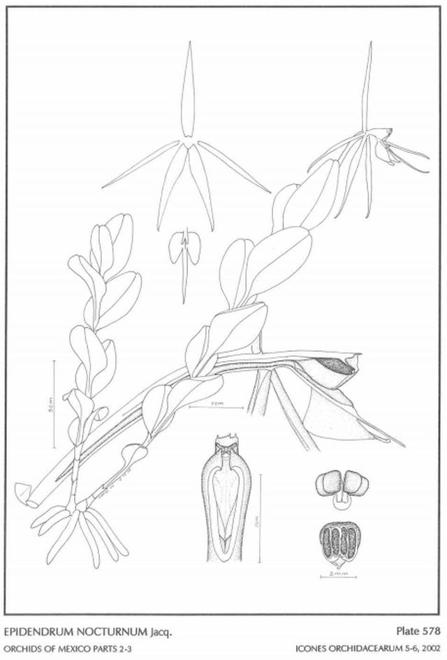 References W3 Tropicos, Kew Monocot list , IPNI Bonplandia Rchb.f 1854; Bonplandia Rchb.f 1855; Bonplandia Rchb.f 1856; Symbolae Antillanae Vol VI Orchidaceae Urban 1909; Symbolae Antillanae Vol VI Orchidaceae Urban 1909 as E nocturnum var latifolium; Symbolae Antillanae Vol VI Orchidaceae Urban 1909 as E nocturnum var tridens; Flora of Jamaica Fawcett & Rendle 1910 drawing fide; Die Orchideen Schlechter 1915; Repert. Spec. Nov. Regni Veg. Beih. 6: 71 Schlechter 1919; Atlas des Orchidees Cultivees Constantin 1920 drawing fide; Repert. Spec. Nov. Regni Veg. Beih. 7: 136 Schlechter 1920; Repert. Spec. Nov. Regni Veg. Beih. 7: 248 Schlechter 1920 as E leucarchne; Repert. Spec. Nov. Regni Veg. Beih. 7: 249 Schlechter 1920; Repert. Sp. Nov. Regni. Veg. Beih. 17: 36. Panama Schlechter 1922; Repert. Spec. Nov. Regni Veg. Beih. 10: 70 Bolivia Schlechter 1922; Repert. Sp. Nov. Regni. Veg. Beih. 19: 40. Costa Rica Schlechter 1923; Repert. Sp. Nov. Regni. Veg. Beih. 19: 120. Costa Rica Schlechter 1923; Repert. Sp. Nov. Regni. Veg. Beih. 19: 215. Costa Rica Schlechter 1923; Repert. Sp. Nov. Regni. Veg. Beih. 27: 68 Colombia Schlechter 1924; Repert. Sp. Nov. Regni. Veg. Beih. 27: 69 Colombia Schlechter 1924 E nocturnum var minor; The Genus Epidendrum Ames 1936; Catalogo Descriptivo de las Orquideas Cubanas Acuna 1938 as Amphiglottis nocturnum; Flore Descriptive des Antilles Francaises H. Stehle 1939; Flore Descriptive des Antilles Francaises H. Stehle 1939 as E nocturnum var angustifolium drawing fide; The Orchids of Panama L.O. Williams & P Allen 1946 drawing fide; Ceiba Vol 5 No 1 L O Williams 1956; AOS Bulletin Vol 27 No 6 1958; Orchids of Peru Vol 2 Fieldiana Schweinfurth 1959 drawing fide; Orchids of Peru Vol 2 Fieldiana Schweinfurth 1959 E nocturnum var minus; Native Orchids of Trinidad Schultes 1960; Native Orchids of Trinidad Schultes 1960 as Epidendrum nocturnum var. minus; AOS Bulletin Vol 30 No 9 1961; AOS Bulletin Vol 31 No 3 1962; AOS Bulletin Vol 33 #8 1964; Venezuelan Orchids Illustrated Vol 3 Dunsterville & Garay 1965 drawing fide; Encyclopedia of Cultivated Orchids Hawkes 1965; AOS Bulletin Vol 36 #9 1967; AOS Bulletin Vol 38 No 6 1969; Die Orchideen lieferung 1 Schlecter/Brieger 1970 photo good; Flora de Venezuela Foldats Volumen XV Part 3 1970; The Native Orchids of Florida Luer 1972 Photos/drawing fide; Flora of the Lesser Antilles Garay & Sweet 1974 drawing fide; Las Orquedias de El Salvador Vol 3 Las Orquedias De El Salvador Vol 1 Hamer 1974 drawing/photo fide; AOS Bulletin Vol 44 #8 1975; Orchidaceae Brasilense Band 1 Pabst & Dungs 1975 drawing fide; Orchidaceae Brasilense Band 1 Pabst & Dungs 1975 as E nocturnum var minor drawing ok; Orquideologia Vol 12 No 3/4 1977/8 photo fide; Die Orchideen 3 Auflage Bd 1 Sonderabdruck aus Schlechter Lieferung 9 513 - 576 Brieger, Maatsch and Senghas 1977 photo fide; Orquideologia Vol 12 No 2/3 1977/8 photo fide; Orchids of Venezuela, An Illustrated Field Guide Vol 1 Dunsterville & Garay 1979 drawing fide; Icones Planetarum Tropicarum plate 090 Dodson 1980 drawing fide; Icones Planetarum Tropicarum plate 097 Dodson 1980 as Epidendrum tungurahuae; Orquídea (Mexico City). 8(1): 3 1981 drawing fide; Las Orquedias de El Salvador Vol 3 Hamer 1981 drawing fide; Las Orquedias de El Salvador Vol 3 Hamer 1981 as Epidendrum latifolium drawing fide; Icones Planetarum Tropicarum plate 723 Dodson 1982 drawing fide; Icones Planetarum Tropicarum plate 428 Dodson 1982 see observation section; ORQUIDEA (Méx.) 9(2): 1984 photo fide; AOS Bulletin Vol 54 No 3 1985 photo fide; Las Orquideas Nativas de Cuba Aleida Diaz 1985 photo fide; AOS Bulletin Vol 55 No 3 1986 photo fide; The Orchids of Surinam Werkhoven 1986 photo fide; An Introdution to the Orchids of Mexico Wiard 1987 photo fide; Selbyana Vol 10 Orchids of Central America Hamer 1988 drawing fide; Orchids Travel By Air A Pictoral Safari Mulder, Mulder-Roelfsema and Schuiteman 1990 photo fide; Native Colombian Orchids Vol 2 COS 1991 photo fide; A Guide to Orchids of the World Hodgson, Paine and Anderson 1991 photo fide; The Manual Of Cultivated Orchid Species Bechtel, Cribb & Launert 1992 photo fide; The Orchids of Puerto Rico and the Virgin Islands Ackerman 1992 drawing fide; Inventaire Taxominique des Plantes de la Guyane Francaise Vol II Les Orchidaceaes Cremers and Hoff 1992; The Illustrated Encyclopedia of Orchids Pridgeon 1992 photo fide; Icones Orchidacearum Peruviarum Plate 051 Bennett & Christenson 1993 as E nocturnum var tumuc-hunaciense drawing ok; Field Guide to the Orchids of Costa Rica and Panama Dressler 1993; Icones Orchidacearum 2 Plate 152 Hagsater & Dodson 1993 see recognition section; Icones Orchidacearum 2 Plate 178 Hagsater & Dodson 1993 see recognition section; Orchids of Brazil McQueen 1993 photo good; An Orchid Flora Of Puerto Rico and the Virgin Islands Ackerman 1995 drawing fide; Manual Of Orchids Stewart 1995; AOS Bulletin Vol 64 No 2 1995 photo fide; AOS Bulletin Vol 65 No 3 1996 photo fide; Iconografia de Orquideas Cubanas Perez & Bocourt 1997 drawing fide; Guatemala Y Sus Orquideas Behar & Tinschert 1998 photo fide; Icones Orchidacearum 3 Plate 305 Hagsater 1999 see recognition section; Icones Orchidacearum 3 Plate 319 Hagsater 1999 see recognition section; Icones Orchidacearum 3 Plate 350 Hagsater & Sanchez 1999 see recognition section; Icones Orchidacearum 3 Plate 355 Hagsater 1999 see recognition section; Icones Orchidacearum 3 Plate 376 Hagsater 1999 see recognition section; Icones Orchidacearum 3 Plate 379 Hagsater 1999 see recognition section; Orchidaceae Antillanae Nir 2000; Harvard Pap. Bot. 5 #2: Carnevali etal. 2001; AOS Bulletin Vol 71 No 4 2002 photo fide; Botanica's Orchids Laurel Glen 2002 photo fide; Icones Orchidacearum 5 & 6 Plate 578 Hagsater, Soto 2002 drawing fide; Orquideas Nativas del Tachira Cesar Fernandez 2003 photo fide; Flora of the Venezuelan Guayana Vol 7 Steyermark, Berry, Yatskievych and Holst 2003; Manual de las Plantas de Costa Rica Vol 3 Ha