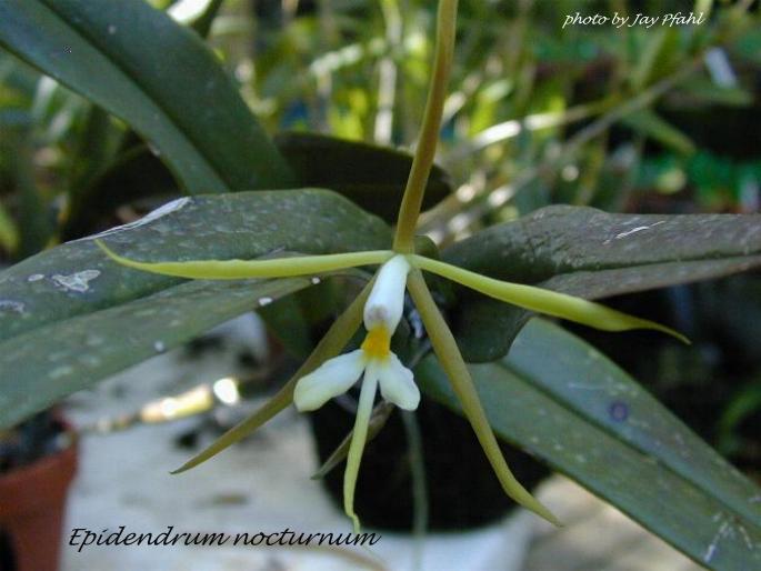 "Epidendrum nocturnum is the type of GROUP Nocturnum characterized by the simple stems carrying large star-shaped flowers usually with a 3-lobed lip. This species is a member of a complex of numerous taxa, that includes some apomyctic and polyploid entities (Veyret, 1982 ), especially in South America, characterized by the caespitose habit, few coriaceous leaves, and pluriracemose inflorescences, the racemes short, producing one star-shaped flower at a time, and the lip trilobed, the midlobe elongate and ensiform. Epidendrum nocturnum is recognized by the terete stems, narrow leaves and the pedicelate ovary about as long as the sepals, with the body of the fruit capsule occupying most of its length. In Mexico, it can only be confused with E. mesocarpum Hágsater, which has shorter, ancipitose stems, fewer, wider leaves, and a long pedicellate ovary, and the body of the fruit occupying about half the length and displaced towards the apex." Hagsater etal 2002