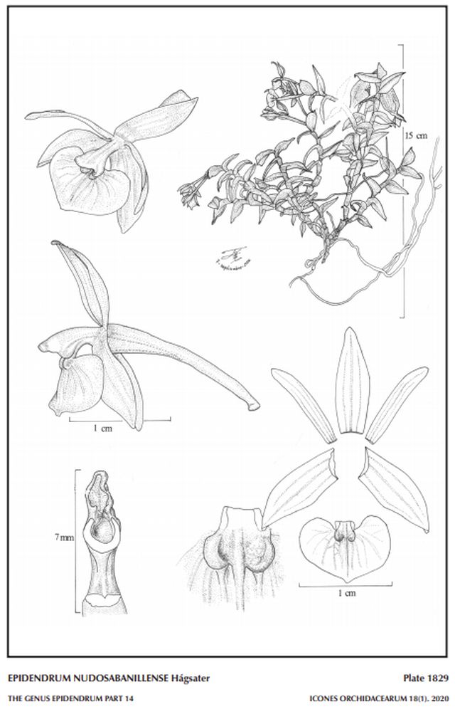 "Epidendrum nudosabanillense belongs to the GROUP Megalospathum with pendent plants, fleshy leaves and large, semi-ovate spathes, and SUBGROUP Tigriphyllum which often has the leaves marked with purple transverse bars. The new species is recognized by the petals narrowly oblong, apex rounded, the cordiform lip, the apex widely obtuse, and the nectary penetrating about half the pedicellate ovary, somewhat widened at the perianth and thereafter narrower. Epidendrum calacaliënse Hágsater & Dodson has petals acute, minutely erose margin, and the shallow nectary does not penetrate the ovary. Epidendrum posadorum Hágsater is similar in size but the stems are laterally compressed, flowers light green with red-purple dots on the column, dorsal sepals 3 to 5 veined, petals linear with an acute apex, and the small lip 1.8 to 2.4" x 2 to .32" [4.5 to 6 x 5 to 8 mm] is cordiform with a single large globose callus, and the nectary penetrates about half the ovary. Epidendrum stanhopeanum Kraenzl. has 3 to 4 somewhat larger, light green with rosy-purple flowers, broader sepals, .2" [5 mm] wide, a longer lip, .4 x .6 "[10 x 15 mm], margin denticulate. Epidendrum microtigriphyllum Ocupa, Hágsater & E.Santiago, has larger plants, leaves .4 to 1" [1.0 to 2.5 cm] long, a column straight and clinandrium hood truncate, and a lip cordiform-reniform, widest beyond the middle .56" [14 mm] wide, and base deeply cordate, callus entire, broad." Hagsater etal 2020