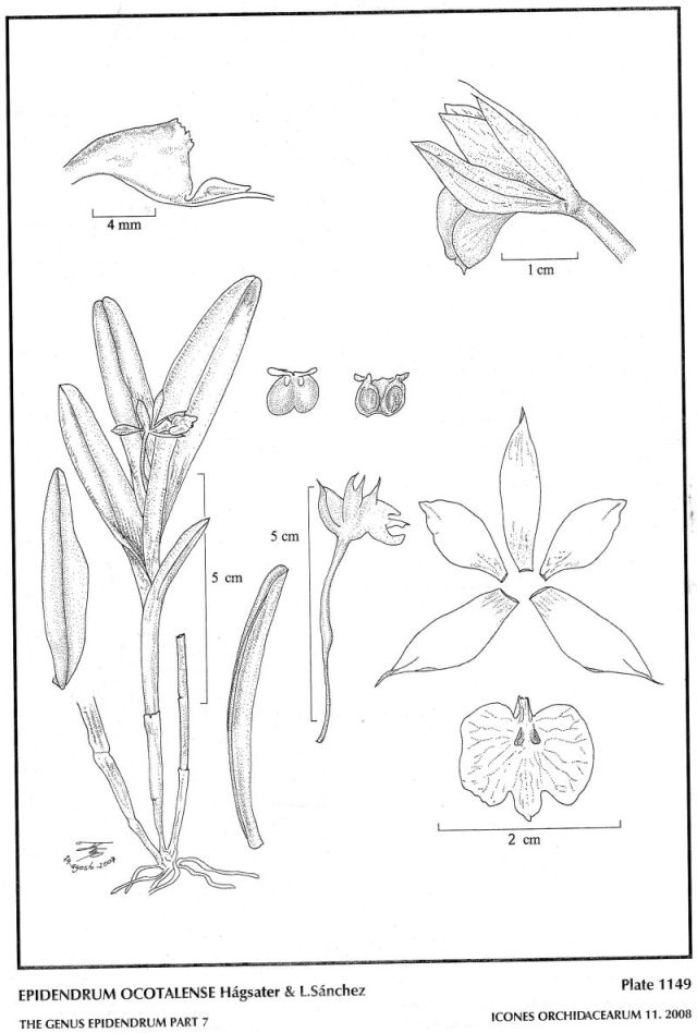 "Epidendrum ocotalense belongs to the GROUP Nocturnum which is characterized by the sympodial, caespitose plants, has cane-like, non-thickened stems, short, racemose or pluri-racemose inflorescence, without spathaceous bracts, usually large, star-shaped flowers, with similar sepals and petals, and usually successive flowers; the flowers are mostly indistinguishable in shape. The species can be recognized by the relatively short plants, stems and leaves reddish, floral segments small and relatively wide, partly spreading sepals .6 to .72" [15 to 18 mm] long, petals .48 to .52" [12 to 13 mm] long, petals rhombic, lip 3-lobed, midlobe very short .12 x .0832" [3.0 x 2.8 mm], subquadrate, the apex triangular, obtuse, only slightly surpassing lhe lateral lobes. It is very similar to Epidendrum buenaventurae F.Lehm. & Kraenzl. but that species has larger, spreading flowers with sepals 1 to 1.84" [25 to 46 mm], linear-lanceolate petals, the lateral lobes of the lip ovate-triangular, acute to rounded, with numerous thickened veins, and a linear-lanceolate, long midlobe .92 to 1.8" {23 to 45 mm], rare along the Pacific slope of Mesoamerica to western Colombia. Epidendrum eburneum Rchb. f. has green leaves, long spreading sepals 1.04 to 1.84" [26 to 46 mm], linear-lanceolate, acuminate petals, and a suborbicular, apiculate lip, rarely with a short sinus on each side of the apicule; found along the Caribbean coast from Honduras to Panama. Epidendrum nocturnum Jacq. has terete stems, green leaves, long spreading sepals 1.6 to 2.8" [40 to 70 mm] long, linear-acuminate petals, and a deeply 3-lobed lip, with a long, linear, acuminate midlobe; widespread throughout the neotropics." Hagsater etal 2008