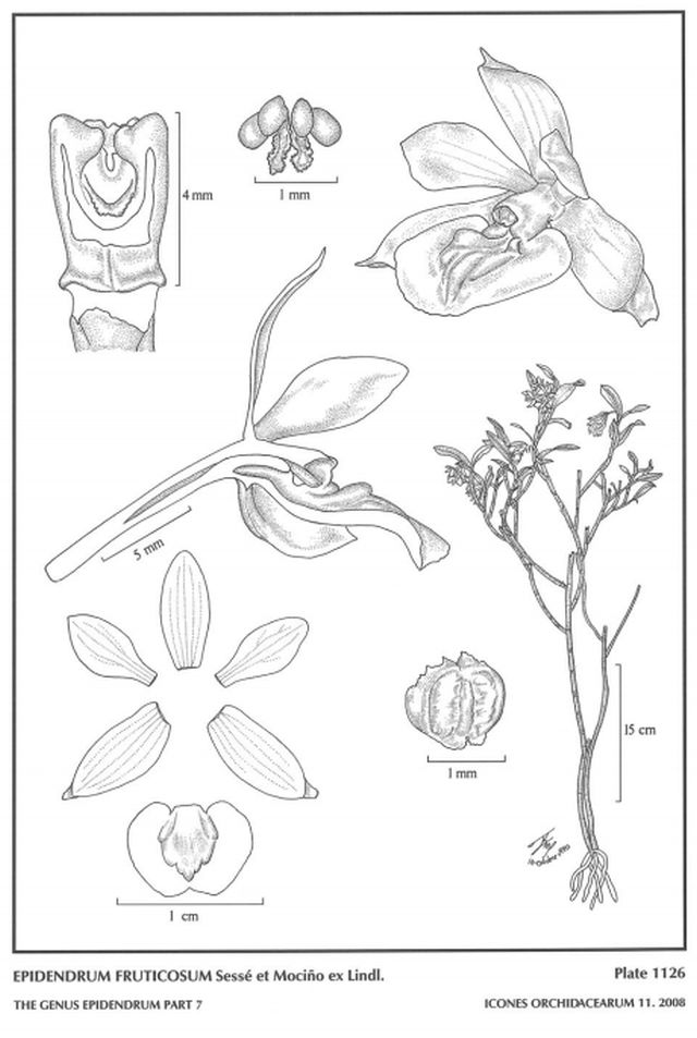 "Epidendrum fruticosum belongs to the GROUP Fruticosum characterized by the plants with caespitose to creeping habit with thin stems, subcoriaceous leaves, racemose, few-f1owered inflorescence, and greenish to purple tinged flowers with the disc of the lip fleshy thickened with 3 rounded keels. The species is recognized by the relatively wide leaves, .4 to 1.3" [1 to 3 cm] wide, greenish yellow to intense wine-purple f1owers with widely spreading floral segments, apex rounded, widely oblanceolate petals, .128 to .192" [3.2 to 4.8 mm] wide, and the reniform lip, the disc with a thickened f1eshy 5-lobed structure. Epidendrum eustirum Ames, F.T.Hubb. & C.Schweinf. has a similarily thickened disc on the lip, but the plant has a caespitose, unbranched habit, relatively narrow leaves .16 to .68" [4 to 17 mm] wide, the green f1owers, narrow, oblanceolate pelals .48 to .6" [1.2 to 1.5 mm] wide. The species is only superficially similar to Epidendrum arbuscula Lindl. which instead of a bush-like habit has successive lateral growths with roots at the base of each new stem, sturdier stems and larger leaves and a 3-lobed lip. Epidendrum propinquum A.Rich. & Galeotti has a clearly bush-like habit, the stems much branched, narrowly elliptic, acute, leaves up to .68" [1.7 cm] wide, greenish-yellow f1owers sometimes tinged purple, the margins of the floral segments revolute, oblanceolate-spatulate petals .6 to 1" [1.5 to 2.5 mm] wide, and the lip ovate-cordiform to triangular-cordiform." Hagsater etal 2008