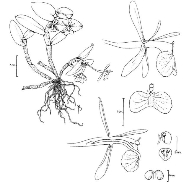 Found in French Guiana in the Atlantic lowlands forest canopy at elevations of 200 to 350 meters as a miniature sized, hot growing epiphyte with a simple, cane-like, strongly laterally compressed, flexuous stem carrying 3 to 5, along the apical 2/3rds of the stem, narrowly elliptic to ovate-elliptic, bilobed apically, margin entire, spreading, coriaceous, light green leaves that blooms in the later spring on an apical, arising on a mature pseudobulb, peduncle inconspicuous, sub-umbellate, sub-sessile, simultaneously 2 flowered inflorescence with much shorter than the ovary floral bracts and carrying resupinate, fragrant, yellow green flowers.