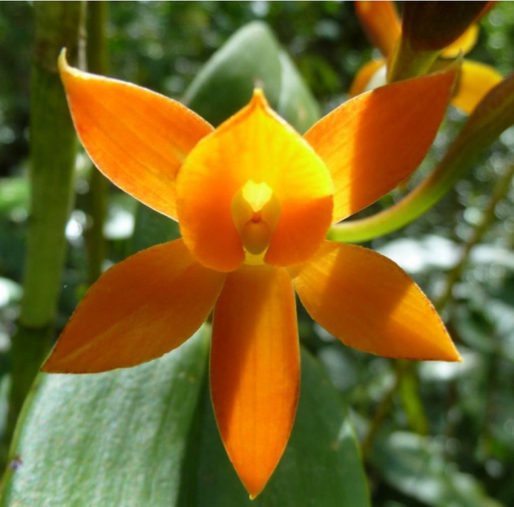 Found in Quindío and Valle de Cauca departments of Colombia on the southern Central Range to northern Ecuador on both slopes of the Andes, at elevations of 2300 to 3200 meters as a small sized, cold growing terrestrial and epiphyte with simple, cane-like, produced from the middle of the previous stem, terete at base, somewhat laterally compressed towards the apex stems; base covered by non-foliar tubular (somewhat infundibuliform apically when dry), scarious, becoming fibrous with age sheaths and carrying 3 to 4, distributed along the apical 1/4 of stems, alternate, spreading, coriaceous, yellowish green; sheaths tubular, somewhat infundibuliform, minutely striated; blade elliptic to narrowly elliptic, apex unequally bilobed, margin entire leaves that blooms in the winter, spring and summer on a terminal, erect, arising through 1 to 2, tubular at base, conduplicate above, apex obtuse to rounded (obovate when spread), membranous spathes, peduncle .24 to .28" [6 to 7 mm] long, totally hidden within the spathe; rachis short, 2 to 2.4" [5 to 6 cm] long (including the flowers), apical, racemose, simultaneously 2 flowered inflorescence with much shorter than the ovary, triangular-ovate, sub-acute, embracing floral bracts and carrying non-resupinate, erect, fleshy, sepia-ochre turning bright orange with age flowers with the fragrance not registered.