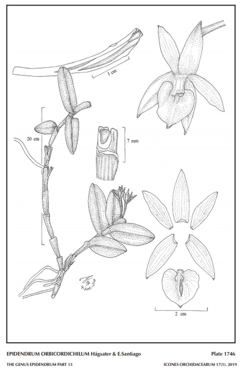 "Epidendrum orbicordichilum belongs to GROUP Geminiflorum characterized by having a sympodial, scandent, straggling habit, semi-ovate spathe, erect stems with 3 to 10 coriaceous leaves, few non-resupinate flowers, and a lip with laminar calli, disc flat. The new species is recognized by the leaves 1.48 to 3.6" x .72 to 1.4" [3.7 to 9.0 x 1.8 to 3.5 cm], elliptic to narrowly elliptic, flowers sepia-ochre turning orange with age, sepals .8" [20 mm] long, the margin spreading, petals .68 x .216" [17 x 5.4 mm], elliptic; lip .56 x .52" [14 x 14 mm], orbicular-cordiform, with a pair of low laminar calli. Epidendrum cuencanum is vegetatively similar, but the flowers are greenish white, sepals .86" [21.5 mm] long with the margins slightly revolute, petals .8 x .08" [20 x 2.0 mm], linear; lip .52 x .5" [13.0 x 12.5 mm], cordiform, with a pair of small calli. Epidendrum megagastrium Lindl. has leaves 1.2 to 2" x .72 to .92" [3.0 to 5.0 x 1.8 to 2.3 cm], flowers copper brown, sepals .802" [20.5 mm] long, petals .74 x .188" [18.5 x 4.7 mm], oblong-elliptic; lip .46 x .4" [11.4 x 10.0 mm], narrowly cordiform with a pair of fleshy, divergent calli and with 3 low ribs, the very evident mid-rib disappearing before reaching the apex. Epidendrum azuayense Hágsater & E.Santiago has leaves .4 to 2" x .32 to .6" [1.0 to 5.0 x 0.8 to 1.5 cm], oblong-elliptic, flowers orange, sepals .52 to .72" [13 to 18 mm] long, petals 12-16 x 5.0-6.0 mm, oblanceolate with the margin crenulate; lip .32 t o.36" x .44" [8.0 to 9.0 x 11 mm], widely cordiform. Epidendrum geminiflorum Kunth has leaves 1.08 to 3.6" x .48 to 1.04" [2.7 to 9.0 x 1.2 to 2.6 cm], oblong; flowers greenish yellow, sepals .56 to .72" [14 to 18 mm] long and the margin revolute, petals .576 to 6.4"x .104 to .132" [14.4 to 16.0 x 2.7 to 3.3 mm], narrowly lanceolate; lip .4 to .52" x .32 to .48" [10 to 13 x 8.0 to 12 mm], 3-lobed, the lateral lobes sub-orbicular to hemi-elliptic, small." Hagsater etal 2019