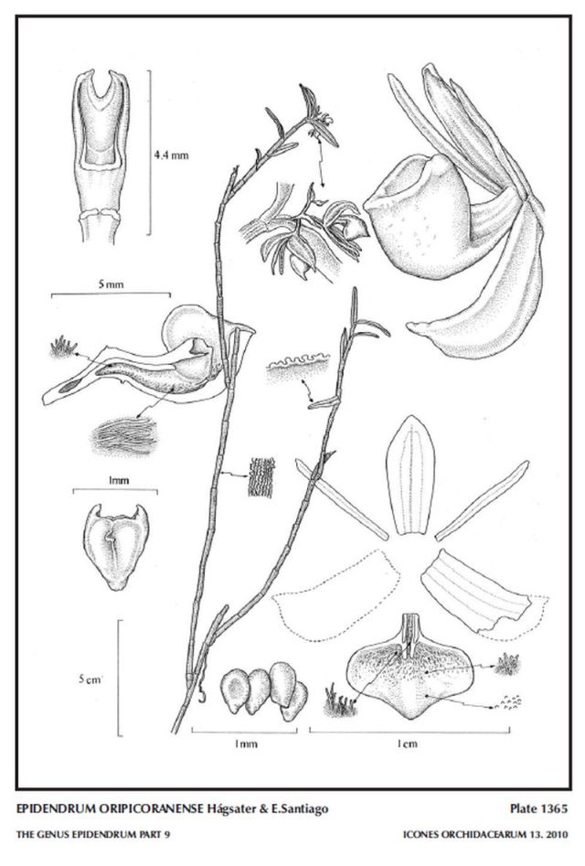 "Epidendrum oripicoranense belongs to the GROUP Elleanthoides SUBGROUP Rhombochilum which is characterized by the thin, branching habit, narrow, short, subcoriaceous leaves with a crenulate margin and unequally bilobed apex, racemose, sub-distichous, short inflorescence with successive flowers, the entire lip embracing the column. The species is recognized by the tall plants producing new stems sub-apically from the older stems, leaves lanceolate-oblong, short, .24 to .92" [.6 to 2.3 cm] long; inflorescence sub-sessile with 2 to 3 greenish purple flowers, sepals .2 to .24" [5 to 6 mm] long, column geniculate with respect to the ovary and strongly arched upwards. This species has been previously confused with Epidendrum spasmosum (Santiago, 2004) which is vegetatively very similar, but flowers are white, the apices of the sepals tinged pink, sepals .3 to .368" [7.5 to 9.2 mm] long, column straight with respect to the ovary and the margin of the lateral lobes of the lip erose (the original description of that species is a combination of that species and the species here described as new). Epidendrum rhodanthum Hágsater & Dodson from northern Ecuador has 4 to 8 pink colored flowers, sepals .34" [8.5 mm] long and the lip transversely elliptic with a minute apicule." Hagsater etal 2010