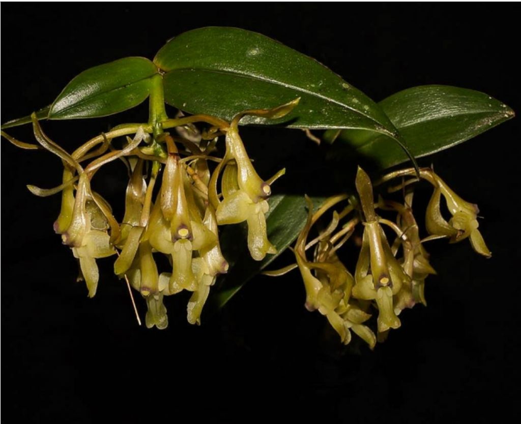 Found in San Martin province of Peru in sparsely dispersed bushes in scloerophyllous wet cloud forest with abundant moss, on Clusia sp., at elevations around 1850 meters as a medium sized, cool groing epiphyte with new stems produced from the sub-apical internodes of the previous stem, cane-like, terete, thin, straight; the basal internodes covered by tubular, nonfoliar, minutely striated, scarious sheaths and carrying Leaves aggregate at the apex of each stem, distichous, sub-coriaceous, dark green, concolor; leaf sheaths infundibuliform when dry; blade narrowly ovate-lanceolate, apex acute, margin entire, spreading leaves that blooms in the summer, without a spathe, peduncle .52" [1.3 cm] long, laterally compressed, green, straight, without bracts, .8 to 1.2" [2 to 3 cm] long overall, racemose, flowering only once, densely simultaneously 7 to 12 flowered inflorescence with a green, much shorter than the ovary, narrowly triangular, acuminate, embracing floral bractsd and carrying , resupinate, ochre-yellow flowers with the apical margin of the column purple; fragrance not registered .