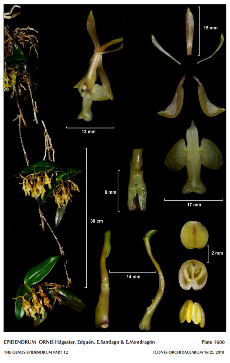 "Epidendrum ornis belongs to the GROUP Arbuscula SUBGROUP Incomptum which is characterized by the erect habit with successive lateral growths produced from the middle of the previous growth, few leaves aggregate towards the apex of the stems, roots generally only from the base of the primordial stem, and with fleshy yellowish to green to violet-green to black flowers with short ovaries, the lip entire to 3- lobed. The species is recognized by the bifoliate stems, leaves ovate-lanceolate, inflorescence with up to 12 ochre-yellow flowers, lateral sepals falcate, .52" [13 mm] long, petals linear-oblanceolate, narrow,.08" [2 mm] wide, and lip clearly 3-lobed, the lateral lobes spreading, obliquely dolabriform, mid-lobe oblong, apically expanded and bilobed. It is reminiscent of Epidendrum tamaënse from the Eastern Andes in Venezuela and neighboring Colombia*, which has 2 to 4 elliptic leaves, up to 17, green to olive-green flowers with purple veins on the lip, lateral sepals oblique, .6 to .84" [15 to 21 mm] long, petals narrowly obtrullate, .28 to .32" [7.0 to 7.8 mm] wide, and the lateral lobes of the lip orbicular. Epidendrum macuchiense Hágsater & E.Santiago, from the western slope of the Andes in Ecuador has 4 lanceolate leaves, green flowers, lateral sepals .4" [10 mm] long, oblique, petals linear-oblanceolate, .04" [1 mm] wide, lip with transversely elliptic to sub-orbicular lateral lobes, and the mid-lobe sub-quadrate-cuneate. Epidendrum boekei Hágsater, from the estern Andes in southern Peru, has narrowly elliptic leaves, 5 to 7, green to greenish yellow flowers, lateral sepals oblique, .48" [12 mm] long, petals oblanceolate, .12 to .24" [3 to 6 mm] wide, and the lateral lobes of the lip obovate, mid-lobe sub-quadrate." Hagsater etal 2018