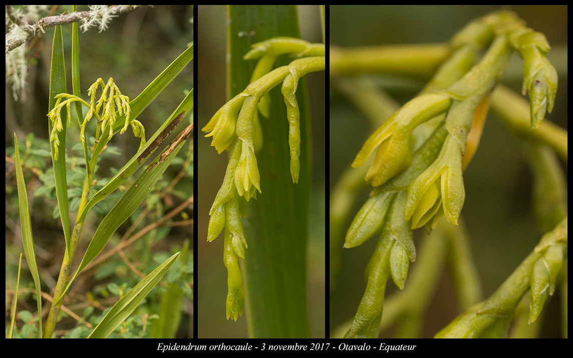 Found in Ecuador in bushes at elevations around 2700 to 3700 meters as a large to giant sized, cold growing terrestrial with a very short rhizome giving rise to terete, erect, straight leafy stems carrying sub-erect, rigid, linear-lanceolate to lanceolate-ligulate, mucronate apically leaves that blooms in the later spring on a terminal, shortly pedunculate, erect, numerously decurved branched, 6 to 10" [15 to 25 cm] long, densely many flowered inflorescence with deltoid-ovate, shortly acuminate, fleshy, as long as the overy floral bracts and carrying very fleshy, greenish, glabrous flowers.