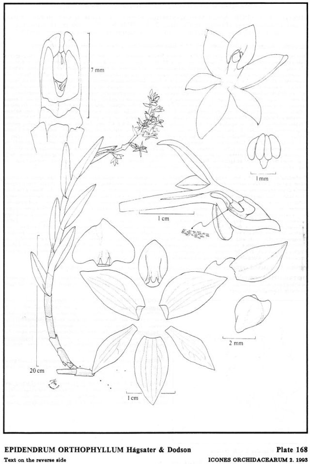 "Epidendrum orthophyllum is part of GROUP Macrostachyum characterized by the monopodial plants with sub-apical branching, rugose leaf sheaths, large leaves generally spreading, racemose, erect inflorescence, and fleshy flowers generally green to black (ripe olive colored), as well as yellow to pink to purple, with an entire, conduplicate, generally ecallose and pubescent lip embracing the column, and the nectary pubescent to papillose in front of the stigmatic cavity and at least at the base of the lip. The species is recognized by the ascending leaves almost parallel to the stem, the rhombic, acute, 2-veined petals, and the widely triangular lip. Epidendrum oxycalyx Hágsater & Dodson has narrower, acuminate floral segments. Epidendrum palaciosii Hágsater & Dodson has flowers about 1/3 the size, the sepals muriculate outside, without keels. Epidendrum obovatipetalum Hágsater & Dodson has wider leaves, rounded floral segments and oblanceolate petals." Hagsater etal 1993