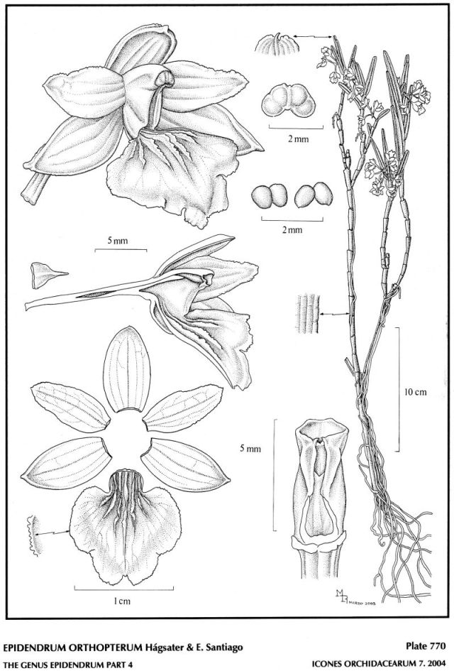 "Epidendrum orthopterum belongs to the GROUP Diothonea SUBGROUP Diothonea which is characterized by the branching plants, linear lanceolate to oblong, bilobed leaves, racemose, arching-nutant inflorescence, membranaceous, rarely fleshy flowers, the entire to 3-lobed, ecallose lip with the margin erose with 1 to 10 thin keels, smooth to erose, the column completely to obliquely united to the lip, the anther reniform. The new species is recognized by the short inflorescence, .8" [2 cm] long, with 10 to 12 flowers, the narrowly ovate, 3-veined petals, .152" [3.8 mm] wide, the lip with 7, erose keels and the column with wings at the union of the column and lip straight, i.e. ·not involute. Epidendrum dolichorhachis has a 2.4 to 5" [6 to 12.5 cm] long inflorescence with 15 to 30 flowers, oblong petals, .92 to 1.04" [2.3 to 2.6 mm] wide, and the lip with 5, erose, serrulate keels. Epidendrum yarumalense Hágsater & E. Santiago has linear oblanceolate, single veined petals, .028 to .056" [.7 to 1.4 mm] wide, the lip has 4 to 5 very low, inconspicuous keels. Epidendrum lloense (Lindl.) Hágsater & Dodson has a 2 to 4.8" [5 to 12 cm] long inflorescence, narrowly ovate to subtrullate, 4 to 5 veined petals, .24 to .26" [6.0-6.6 mm] wide, 5 low keels on the lip forming a convex disc and a very prominent and involute column foot. Epidendrum gratissimum (Rchb. f.) Hágsater & Dodson has ovate petals, and the subreniform, apically 4-lobed lip, with 3 to 5, laminar, erose keels." Hagsater etal 2004
