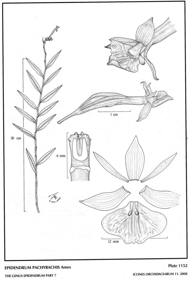 "Epidendrum pachyrachis is a part of GROUP Smaragdinum haracterized, by the caespitose, sympodial habit the stem carrying many leaves of which the surface is parchment-like when dry, the thickened rachis and carrying small, successive, basaically green flowers. The species is recognized by the lanceolate to lanceolate-elliptic leaves, the short inflorescence, with up to 18 successive, very fleshy, green flowers, the lip transversely elliptic to reniform, with radiating thickened veins at the truncate base, and three elongate central keels, the column short and bidentate at the apex, The South American Epidendrum smaragdinum Lindl. is vegetatively very similar , and epiphytic and myrmecophilous or terrestrial, but the flowers are green, spotless, with the lip dearly 3-lobed, the midlobe entire and apiculate. The terrestrial or lithophytic Epidendrum orchidiflorum Salzm. has much taller plants, up to 100" [2.5 meters] tall, with a very long peduncle of the inflorescence, the flowers greenish with brown to purple dots, the lip clearly 3- lobed, with the midlobe deeply emarginate" Hagsater 2008
