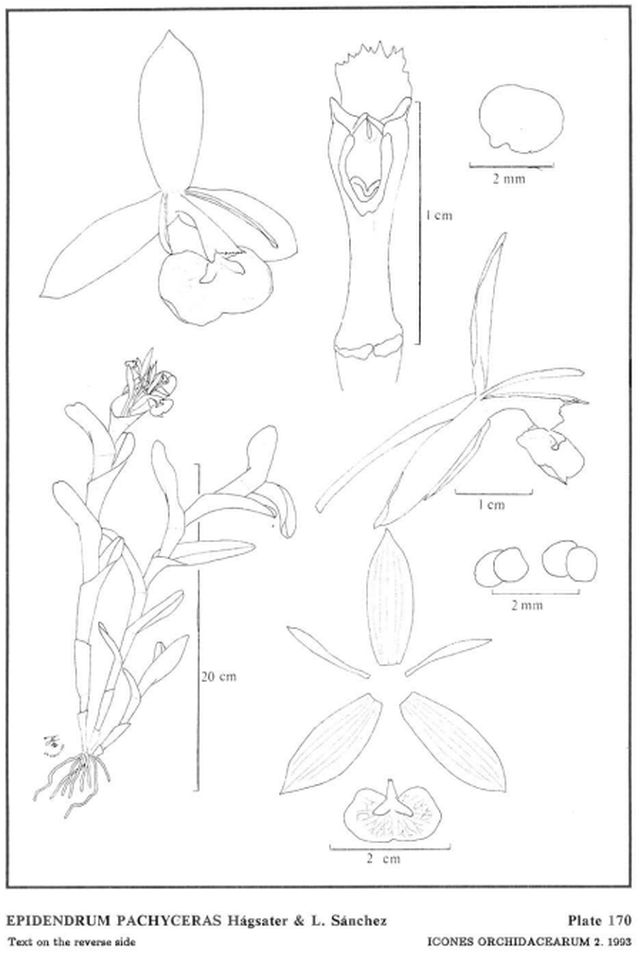 "Epidendrum pachyceras is a member of the GROUP Difforme characterized by the caespitose, sympodial plants, fleshy, pale green to glaucous leaves, apical inflorescence, sessile, rarely with a short peduncle, one-flowered to many-flowered, and then corymbose, without spathaceous bracts, fleshy, green to yellowish-green rarely white flowers. The species can be recognized by the strongly laterally compressed stems, 1 to 3 flowered inflorescence carrying fragrant flowers with entire, reniform, retuse lip, calli divergent, thick, prominent, acute, column with two lateral-apical, obtuse petaloid processes, and clinandrium very prominent with margin dentate-fimbriate. It is similar to E. apaganum Mansf., from Ecuador and Peru, which has obtuse lip, column without lateral-apical processes, and smaller, subglobose calli. distinguish thios species from others in the section.
