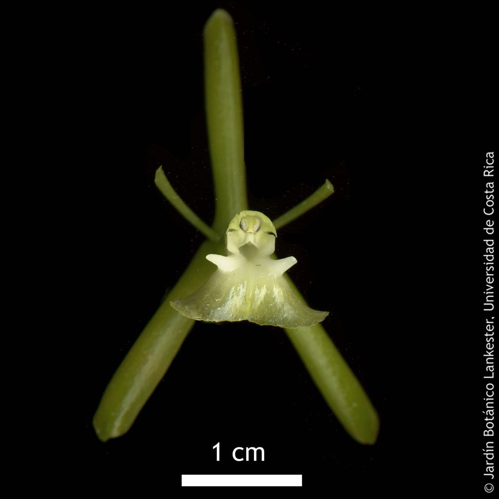 Found in Costa Rica and Panama in cloud forests at elevations of 1320 to 2500 meters as a miniature to just medium sized, cool to cold growing epiphyte with reed-like, strongly laterally compressed, flexuous stems carrying 2 to 7, elliptic, apically bilobed, coriaceous, basally clasping leaves that blooms on a terminal, sessile, occuring only once, simultaneously, 1 to 3 flowered inflorescence carrying resupinate, green, nocturnally fragrant flowers.