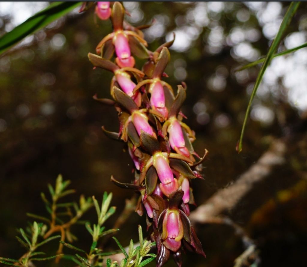 Found in northern Peru, from the border of the departments of San Martín and Amazonas, on the drier western slopes of the Alto Mayo, on Polylepis sp. (Rosaceae), at elevations of 3400 to 3650 meters as a medium sized, cold growing epiphyte with simple, cane-like, thin, terete at base, laterally compressed towards the apex, (but not ancipitose); base covered by tubular, non-foliar, scarious sheaths and carrying 8 to 9, distributed along the apical 2/3 of the stems, alternate, distichous, articulate, coriaceous, sub-erect with respect to the stem, green, concolor; leaf sheaths, tubular, striated, red-brown; blades unequal, progressively larger, sometimes the apical leaf much reduced and somewhat bract-like, narrowly lanceolate, obtuse to sub-acute, margin crenate, somewhat revolute leaves that blooms in the summer and again in the late winter and early spring on a terminal, without a spathe, peduncle 1.0-3.0 x 0.4 cm long, terete, green, concolor, thick; rachis 6-8 cm long, nearly totally hidden by the flowers, 2.8 to 4.4" [7 to 11 cm] long, apical, racemose, densely flowered, arching-nutant, successively, from the middle towards the ends, eventually all open simultaneously, 9 to 18 flowered inflorescence with shorter to nearly as long as the ovary, linear-triangular, acuminate, embracing floral bracts and carrying , resupinate flowers with the sepals and petals buff to olive-green, somewhat tinged pink near the base, lip deep to pale purple, somewhat turning buff towards the margins, column greenish tinged fuchsia towards the apical half; fragrance especially strong from morning to mid-day, agreeable, reminiscent of mint.