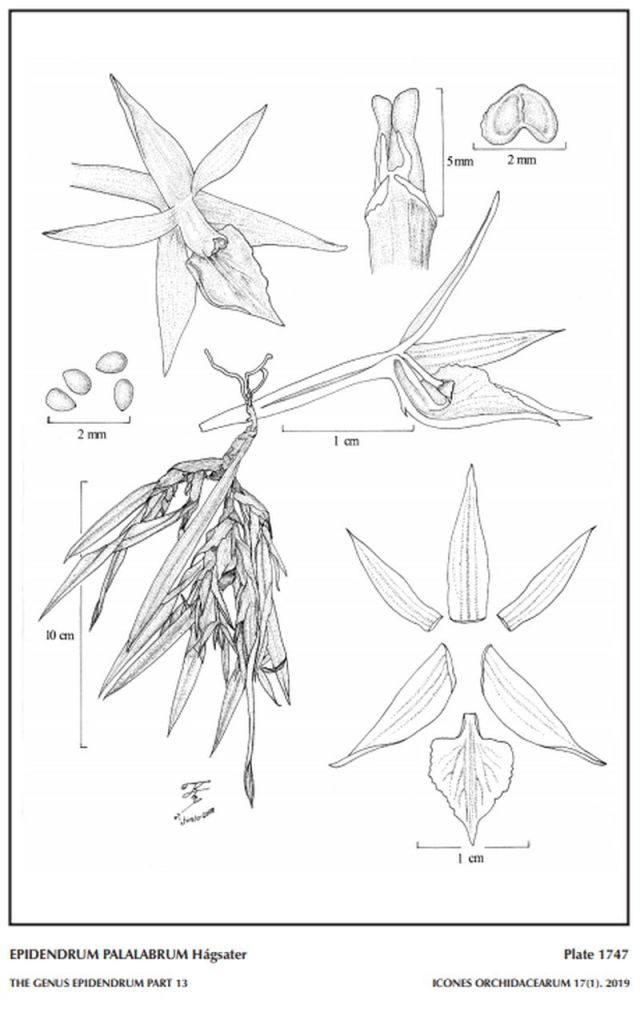 "Epidendrum palalabrum belongs to the GROUP Kalopternix SUBGROUP Garayii which is recognized by pendent chain of stems, arising each from a sub-apical internode of the previous stem, each with 1 to 3 linear-lanceolate leaves, inflorescence apical, flowering only once, 1 to 2 flowered, the flowers non-resupinate, green to red or yellow, the lip cordiform, ecallose. The new species is recognized by the pale brown flowers, sepals .52 to .56" x .148 to .16" [13 to 14 x 3.7 to 4.0 mm], lanceolate, acuminate, 3-veined, petals .468 x .1" [11.7 x 2.5 mm], lanceolate, acuminate and lip shovel-shaped, base truncate, basal half quadrate, apical half triangular, apex acuminate, margin erose. Epidendrum carmelense Hágsater & Dodson has plants .48 to 1.92" [12-48 cm] long, forming large mases, flowers green to ochre with reddish dots on the column, sepals .4 x .26" [10 x 6.5 mm], ovate, acute, petals .34 x .14" [8.5 x 3.5 mm], ovate-elliptic, acute; lip .28 x .44" [7 x 11 mm], reniform, base cordate, apex rounded. It is vegetatively very similar to Epidendrum cardiodontatum Hágsater & Dodson, but the inflorescence has 7 successive flowers, lip subcordiform, base cordate. Epidendrum garayi Lřjtant has 3 to 4 leaves per pseudobulb, flowers greenish purple, sepals .4 to .48" [10 to 12 mm] long, lip cordiform, acuminate. Epidendrum falsigarayi Hágsater & Karremans has 3 to 6 leaved stem segments, leaves 1 to 2" x .12 to .2" [25 to 50 x 3 to 5 mm], 1 brick-red flower, ovate, acimunate sepals .48 to .492" [12 to 12.3 mm] long, triangular ovate, acute petals, .354 x .11" [8.6 x 4.4 mm], and a cordiform, apiculate lip .292 x .354" [7.3 x 9.6 mm]." Hagsater etal 2019