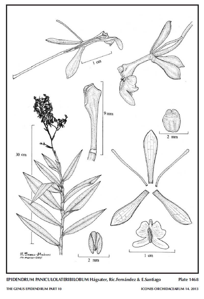 paniculatum has elliptic leaves, the lip marked with reddish-purple, the lateral lobes of the lip sub-orbicular and the midlobe bilobed, formed by a pair of strongly divaricate, falcate lobes, and is endemic to northwestern Peru. Epidendrum