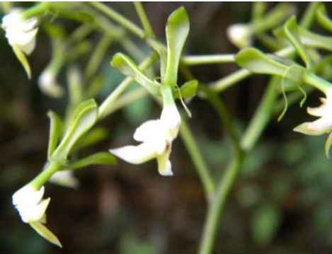 100" [2.5 meters] tall, elliptic leaves 3.2 to 5,6" [8 to 14 cm] long, .44" [11 mm] long sepals, and an immaculate lip with bilobed lateral lobes." Hagsater etal 2013