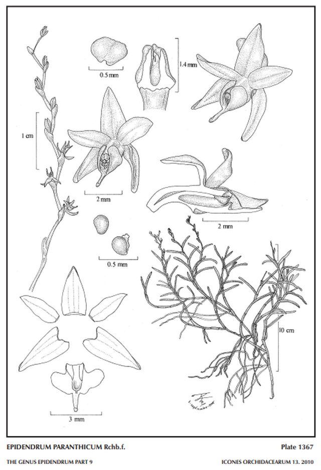 "Epidendrum paranthicum belongs to the GROUP Epidanthus , which is characterized by short small, somewhat scandent plants with very thin stems, very narrow, more or less fleshy leaves, with a small, narrowly triangular, acute ligule opposite the blade, an apical, distichous, usually secund inflorescence, and 2 or 4 pollinia. The species is recognized by the delicate plants, 3.6 to 5.2" [8.5 to 13 cm] tall, with acicular, linear leaves, small sepals .1 to .132" [2.5 to 3.3 mm] long, variable color flowers, the dorsal sepal and petals somewhat reflexed, 3-lobed lip with the callus semi-circular and minutely apiculate. Epidendrum tritropianthum Hágsater & E.Santiago is vegetatively very similar, but the flowers are white, with the margin of the lateral lobes of the lip reddish purple, the petals spreading and the lip ecallose with 3 low keels. Epidendrum isolatum Barringer has similar sized plants but the stems very short and robust 1.2 to 2" x .1 to .12" [3 to 5 x .25 to .3 cm), oblong-elliptic, very fleshy leaves, ochre-colored flowers and lanceolate, reflexed petals. *NOTE: Numerous color forms have been detected, in particular in Costa Rica, but because no consistent difference has been found in the vegetative or floral structures, we have not given them any taxonomic status. The general coloration is yellow or yellow green, but in Monteverde and Palma de San Ramón (Alajuela) the flowers are white with a yellow lip; on the Fila de Savegre the flowers are brownish red; and the Endres specimens from Cartago, Pizirres(?) are described as white dotted with purple." Hagsater etal 2010