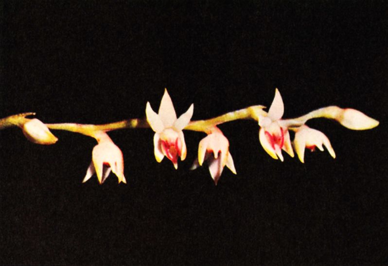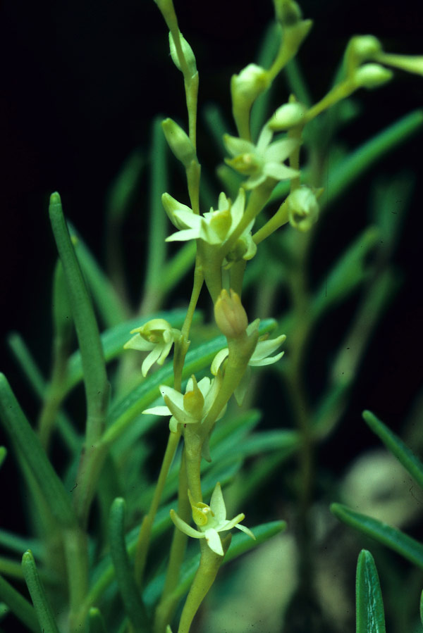 Found in Mexico, Guatemala, Belize, Honduras, Nicaragua, Costa Rica and Panama at elevations of 900 to 1560 meters as a mini-miniature sized, warm to cool growing epiphyte or lithophyte with simple, produced from the basal nodes of the previous stem, terete, very thin, erect stems carrying 5 to 8, distributed along the stem, alternate, more or less fleshy, erect-spreading, acicular to linear, acute, entire marginally, articulate below into the base leaves that blooms in the later spring and early summer on a terminal, racemose, occuring only once, distichous, erect, laterally compressed, secund, rachis somewhat zigzag, lax, successively 4 to 12 flowered inflorescence with a bract at the middle, similar to the longer than the ovary, amplexicaul, widely triangular, basally tubular, acute apically floral bract and carrying fleshy flowers.