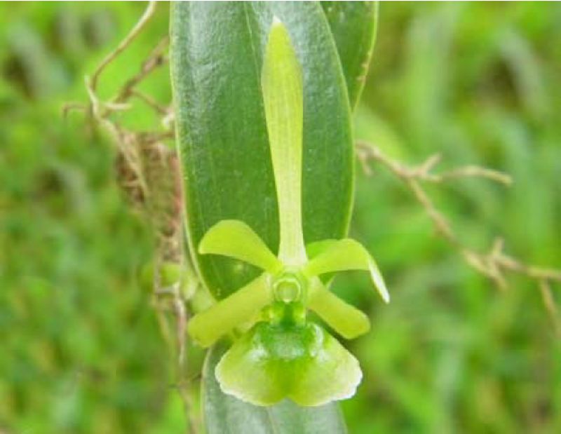 Found in Valle de Cauca department of Colombia on isolated, mature trees at elevations around 100 meters as a miniture sized, hot growing epiphyte with simple, cane-like, laterally compressed towards the apex, flexuous stems carrying 3 to 4, all along the stem, elliptic to lanceolate-elliptic, retuse to asymetrically bilobed, minutely aristate, coriaceous, green, primary veins marked pale green on the dorsal surface, margin entire leaves that boooms in the winter on a terminal, without a spathe, sessile, simultaneously 1 to 2 flowered inflorescence carrying resupinate flowers with the lip, petals, sepals and the base to the middle of the column pale green, the disc and calli of the lip as well as the apical half of the column are deep green.