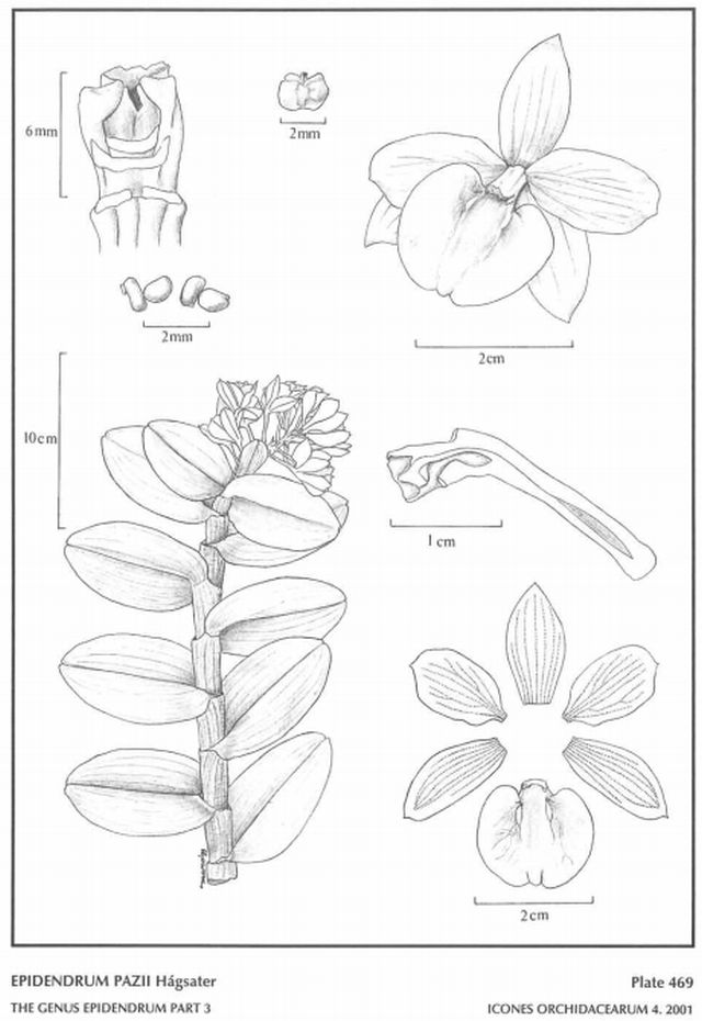 References W3 Tropicos, Kew Monocot list , IPNI ; * Icones Orchidacearum 4 Plate 469 Hagsater & Sanchez 2001 drawing fide; Icones Orchidacearum 4 Plate 479 Hagsater 2001 see recognition section; Icones Orchidacearum 7 Plate 787 Hagsater and Sanchez 2004 see recognition section; Icones Orchidacearum 12 Plate 1225 Hagsater 2009 see recognition section; Icones Orchidacearum 12 Plate 1253 Hagsater 2009 see recognition section; Orchids of the Department of Valle De Cauca Colombia Vol 2 Kolanowska, Hagsater etal. 2014 drawing/photo fide; Orquideas, Tesoro de Colombia Vol 2 Ortiz & Uribe 2017 drawing fide; Orquideas, Tesoro de Colombia Vol 2 Ortiz & Uribe 2017 as E aff pazii photo fide fide;