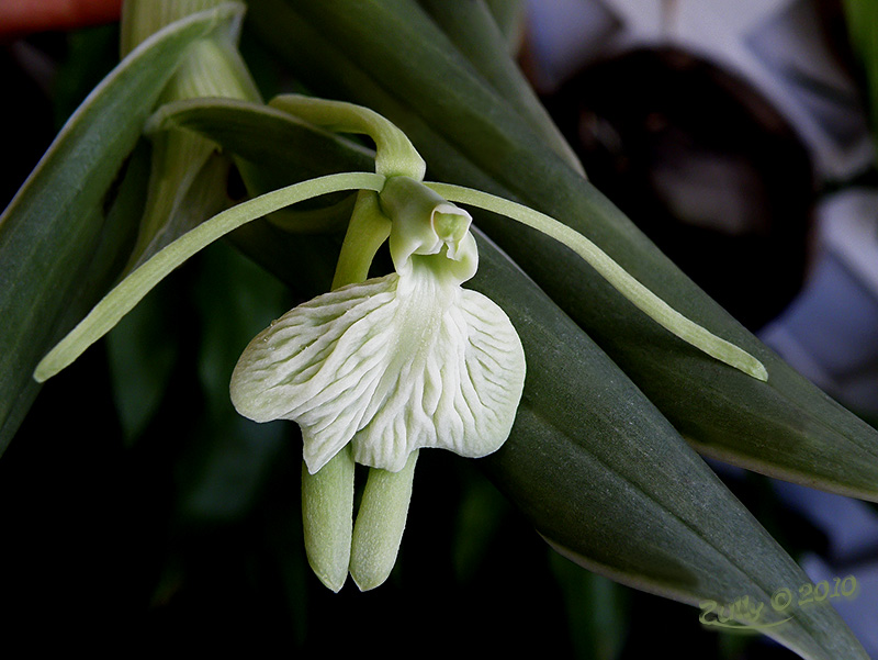 Found in Costa Rica and Panama in montane forests at elevations of 800 to 1000 meters as a small to medium sized, warm growing epiphyte with simple, laterally compressed, ancipitous stems carrying 8 to 12, equidistant along the stem, lanceolate to elliptic-lanceolate, retuse, fleshy, margin entire, obliquely pendant, grayish green leaves that blooms in the winter and spring on a pendant, terminal to lateral, sessile, 1 to rarely 2 flowered inflorescence with shorter than the ovaries floral bracts.