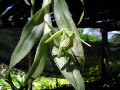 "Epidendrum pendens belongs to the GROUP Difforme which is characterized by the caespitose sympodial plants, fleshy, pale green to glaucous leaves, apical inflorescence, sessile, rarely with a short peduncle, one-flowered to corymbose, without spathaceous bracts, fleshy, green to yellowish-green rarely white flowers. The species can be recognized by its pendent plants, laterally compressed stems, green-grayish reaves and flowers; 1 to rarely 2 large flowers, sepals 9-veined, lip 3-lobed wlth many thickened veins. This species is unique within the GROUP Difforme due to the pendent plants and the lateral inflorescence. It is vegetatively similar to Epidendrum rhizomaniacum Rchb. f. but that species has erect plants, roots growing basally and from the nodes of the stems, green leaves, 2 to 3 white flowers and triquetrous ovary. There are other species of the Difforme Group such as Epidendrum vulgoamparoanum, Epidendrum romero-castañeda , Epidendrum platychilum & Epidendrum kerryae with thickened veins on the lip but those species are very different and the plants are erect not pendent." Hagsater etal 2007