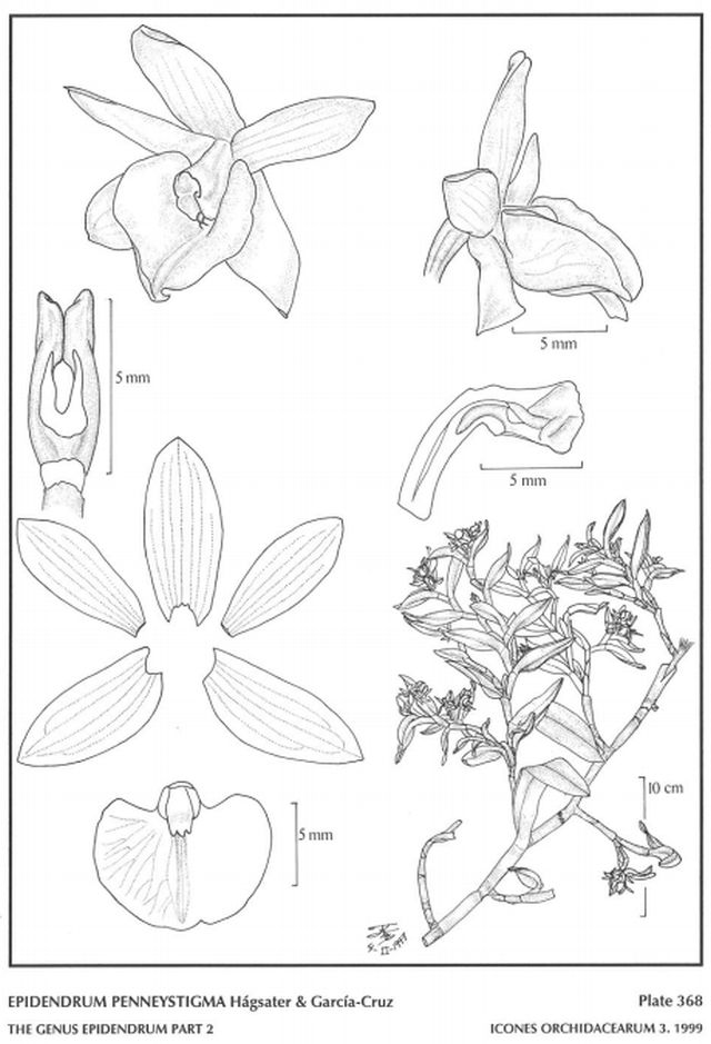 "Epidendrum penneystigma is part of GROUP Ramosum SUBGROUP Platystigma characterized by Vanda-like plants when young; before branching occurs, with long, strap-like leaves. The species has elliptic, obliquely bilobed, rounded leaves, those on the principal stem 4.4 x 1" [ 11 x 2.5 cm], those on the secondary and terciary branches .6 to 2" x .28" to .6" [1.5 to 5 x .7 to 1.5 cm], a racemose inflorescence with non-imbricate floral bracts, white flowers and elliptic-lanceolate, acute, slightly mucronate sepals that are .16 to .2" [1.5 to 2 mm] wide, a heart based lip that envelopes the column completely, a laminar, tridentate callus and a strongly arcuate ovary." Hagsater etal 1999